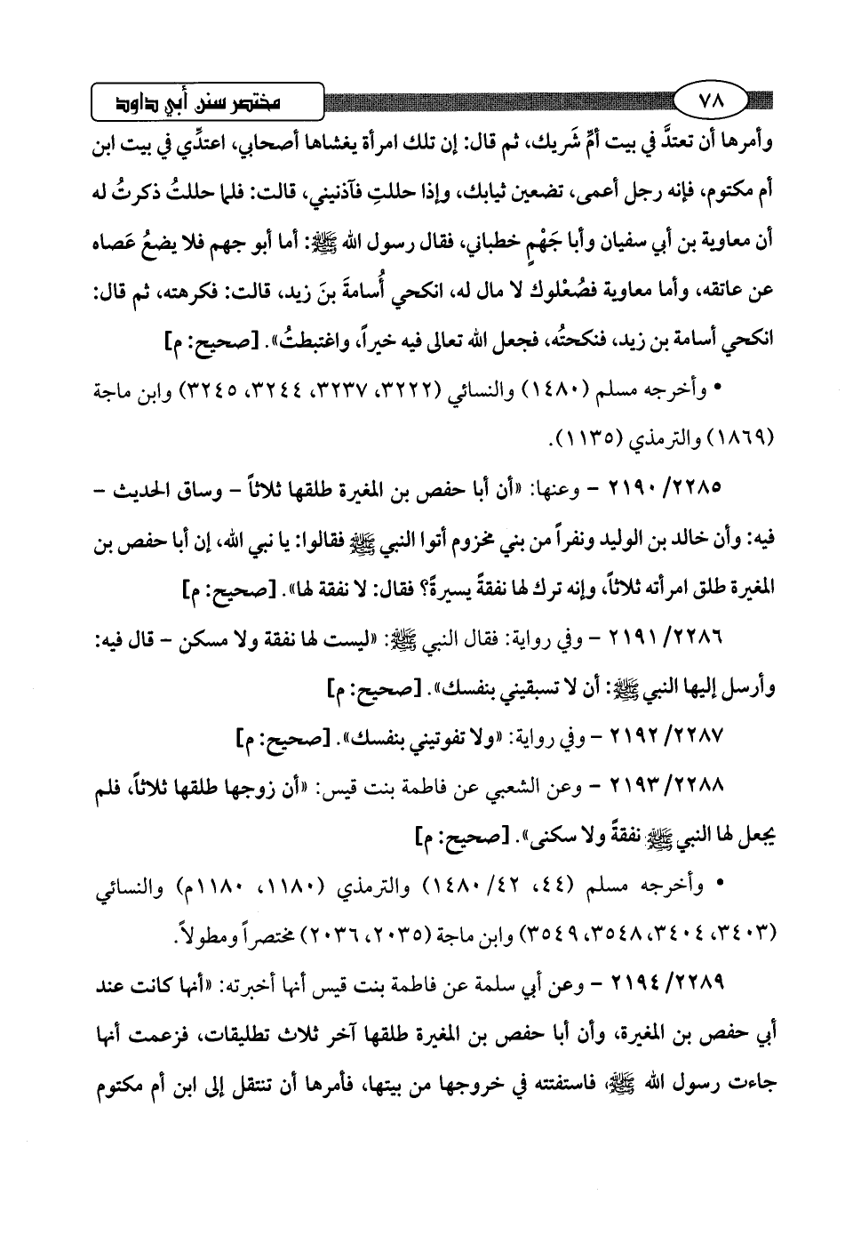 2289/ 2194 - وعن أبي سلمة عن فاطمة بنت قيس أنها أخبرته: "أنها كانت عند أبي حفص بن المغيرة، وأن أبا حفص بن المغيرة طلقها آخر ثلاث تطليقات، فزعمت أنها جاءت رسول اللَّه -صلى اللَّه عليه وسلم- فاستفتته في خروجها من بيتها، فأمرها أن تنتقل إلى ابن أم مكتوم