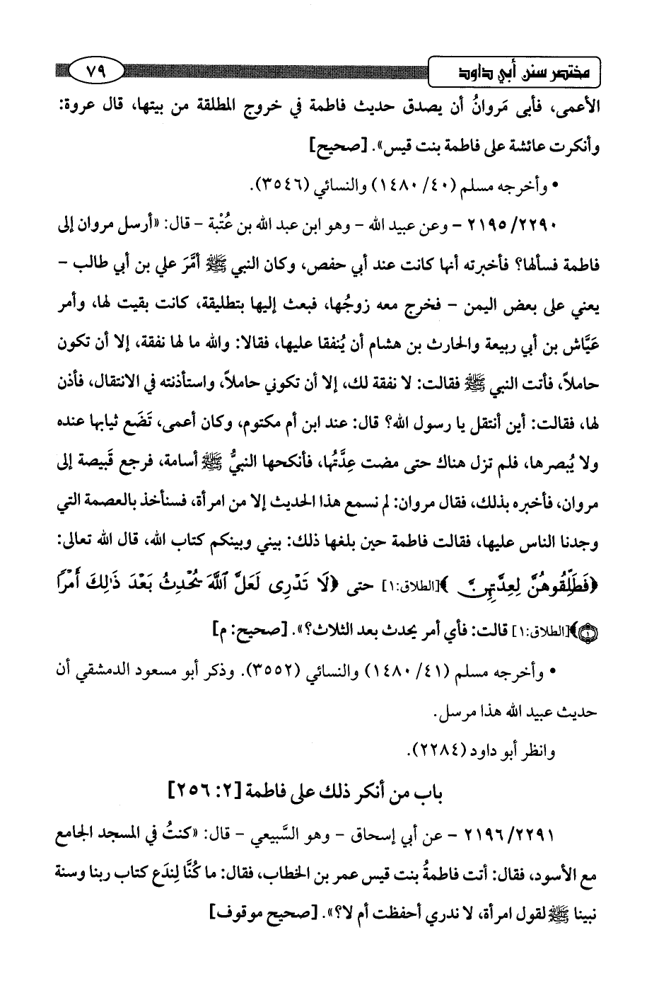 2290/ 2195 - وعن عبيد اللَّه -وهو ابن عبد اللَّه بن عُتْبة- قال: "أرسل مروان إلى فاطمة فسألها؟ فأخبرته أنها كانت عند أبي حفص، وكان النبي -صلى اللَّه عليه وسلم- أمَّرَ علي بن أبي طالب -يعني على بعض اليمن- فخرج معه زوجُها، فبعث إليها بتطليقة، كانت بقيت لها، وأمر عَيَّاش بن أبي ربيعة والحارث بن هشام أن يُنفقا عليها، فقالا: واللَّه ما لها نفقة، إلا أن تكون حاملًا، فأتت النبي -صلى اللَّه عليه وسلم- فقالت: لا نفقة لك، إلا أن تكوني حاملًا، واستأذنته في الانتقال، فأذن لها، فقالت: أين أنتقل يا رسول اللَّه؟ قال: عند ابن أم مكتوم، وكان أعمى، تَضَع ثيابها عنده ولا يُبصرها، فلم تزل هناك حتى مضت عِدَّتُها، فأنكحها النبيُّ -صلى اللَّه عليه وسلم- أسامة، فرجع قَبيصة إلى مروان، فأخبره بذلك، فقال مروان: لم نسمع هذا الحديث إلا من امرأة، فسنأخذ بالعصمة التي وجدنا الناس عليها، فقالت فاطمة حين بلغها ذلك: بيني وبينكم كتاب اللَّه، قال اللَّه تعالى: {فَطَلِّقُوهُنَّ لِعِدَّتِهِنَّ} [الطلاق: 1] حتى {لَا تَدْرِي لَعَلَّ اللَّهَ يُحْدِثُ بَعْدَ ذَلِكَ أَمْرًا (1)} [الطلاق: 1] قالت: فأي أمر يحدث بعد الثلاث؟ ".hصحيح: م]