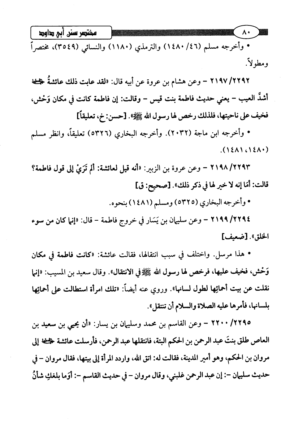 2292/ 2197 - وعن هشام بن عروة عن أبيه قال: "لقد عابت ذلك عائشةُ -رضي اللَّه عنها- أشدَّ العيب -يعني حديث فاطمة بنت قيس- وقالت: إن فاطمة كانت في مكان وَحْش، فخيف على ناحيتها، فلذلك رخص لها رسول اللَّه -صلى اللَّه عليه وسلم-".hحسن: خ، تعليقًا]