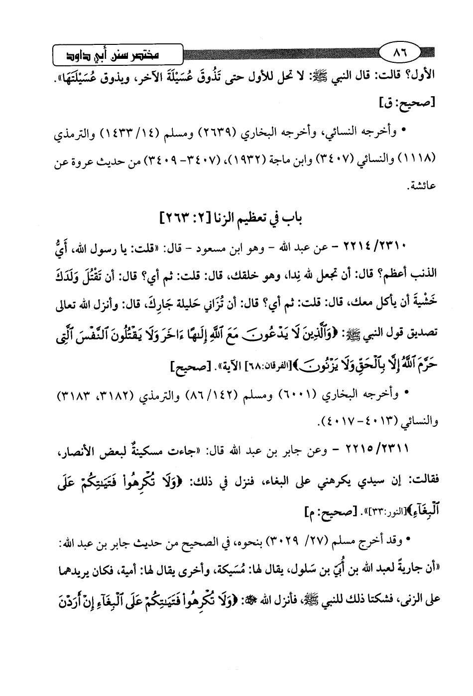 2310/ 2214 - عن عبد اللَّه -وهو ابن مسعود- قال: "قلت: يا رسول اللَّه، أَيُّ الذنب أعظم؟ قال: أن تجعل للَّه نِدا، وهو خلقك، قال: قلت: ثم أي؟ قال: أن تَقْتُلَ وَلَدَكَ خَشْيةَ أن يأكل معك، قال: قلت: ثم أي؟ قال: أن تُزَاني حَليلة جَارِكَ، قال: وأنزل اللَّه تعالى تصديق قول النبي -صلى اللَّه عليه وسلم-: {وَالَّذِينَ لَا يَدْعُونَ مَعَ اللَّهِ إِلَهًا آخَرَ وَلَا يَقْتُلُونَ النَّفْسَ الَّتِي حَرَّمَ اللَّهُ إِلَّا بِالْحَقِّ وَلَا يَزْنُونَ} [الفرقان: 68] الآية".hصحيح]