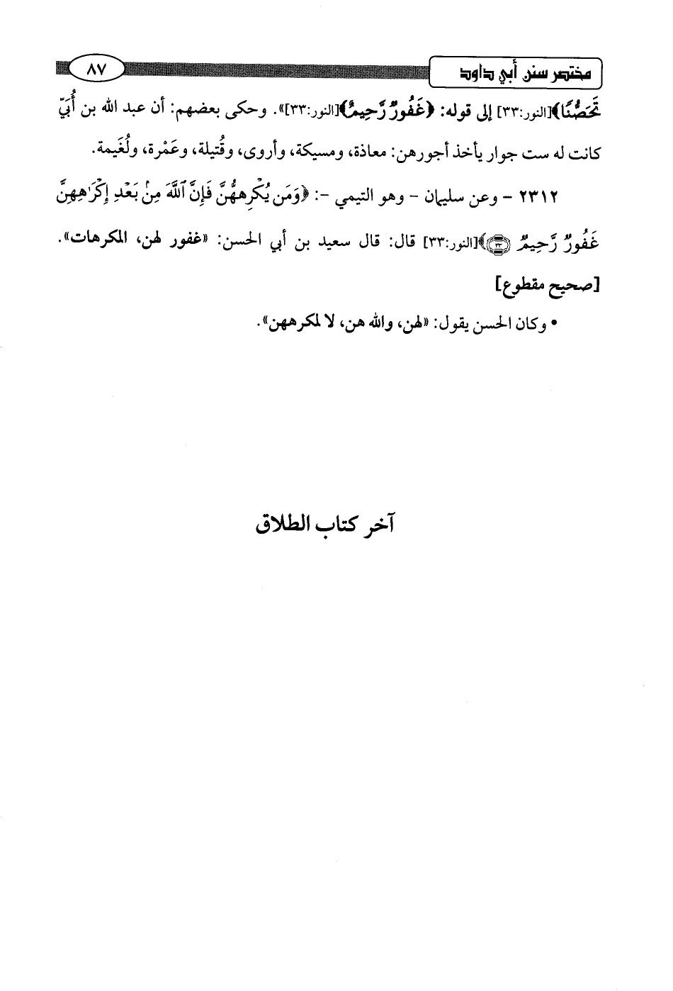 2312 - وعن سليمان -وهو التيمي-: {وَمَنْ يُكْرِهْهُنَّ فَإِنَّ اللَّهَ مِنْ بَعْدِ إِكْرَاهِهِنَّ غَفُورٌ رَحِيمٌ (33)} [النور: 33] قال: قال سعيد بن أبي الحسن: "غفور لهن، المكرهات".hصحيح مقطوع]