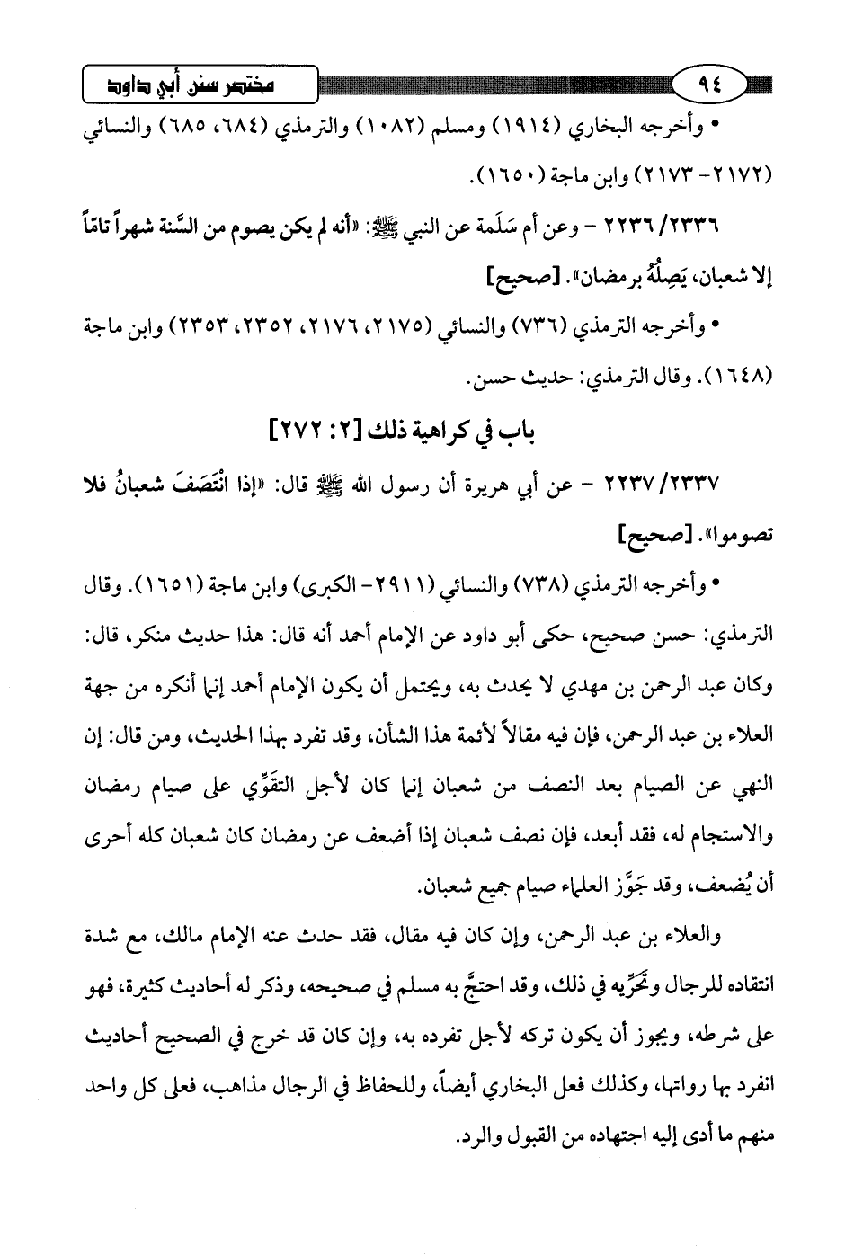 • وأخرجه الترمذي (738) والنسائي (2911 - الكبرى) وابن ماجة (1651). وقال الترمذي: حسن صحيح، حكى أبو داود عن الإمام أحمد أنه قال: هذا حديث منكر، قال: وكان عبد الرحمن بن مهدي لا يحدث به، ويحتمل أن يكون الإمام أحمد إنما أنكره من جهة العلاء بن عبد الرحمن، فإن فيه مقالًا لأئمة هذا الشأن، وقد تفرد بهذا الحديث، ومن قال: إن النهي عن الصيام بعد النصف من شعبان إنما كان لأجل التقَوِّي على صيام رمضان والاستجام له، فقد أبعد، فإن نصف شعبان إذا أضعف عن رمضان كان شعبان كله أحرى أن يُضعف، وقد جَوَّز العلماء صيام جميع شعبان.