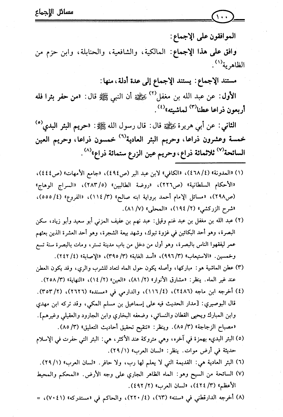 الأول: عن عبد اللَّه بن مغفل (¬2) -رضي اللَّه عنه- أن النبي -صلى اللَّه عليه وسلم- قال: "من حفر بئرا فله أربعون ذراعا عطنا (¬3) لماشيته" (¬4).