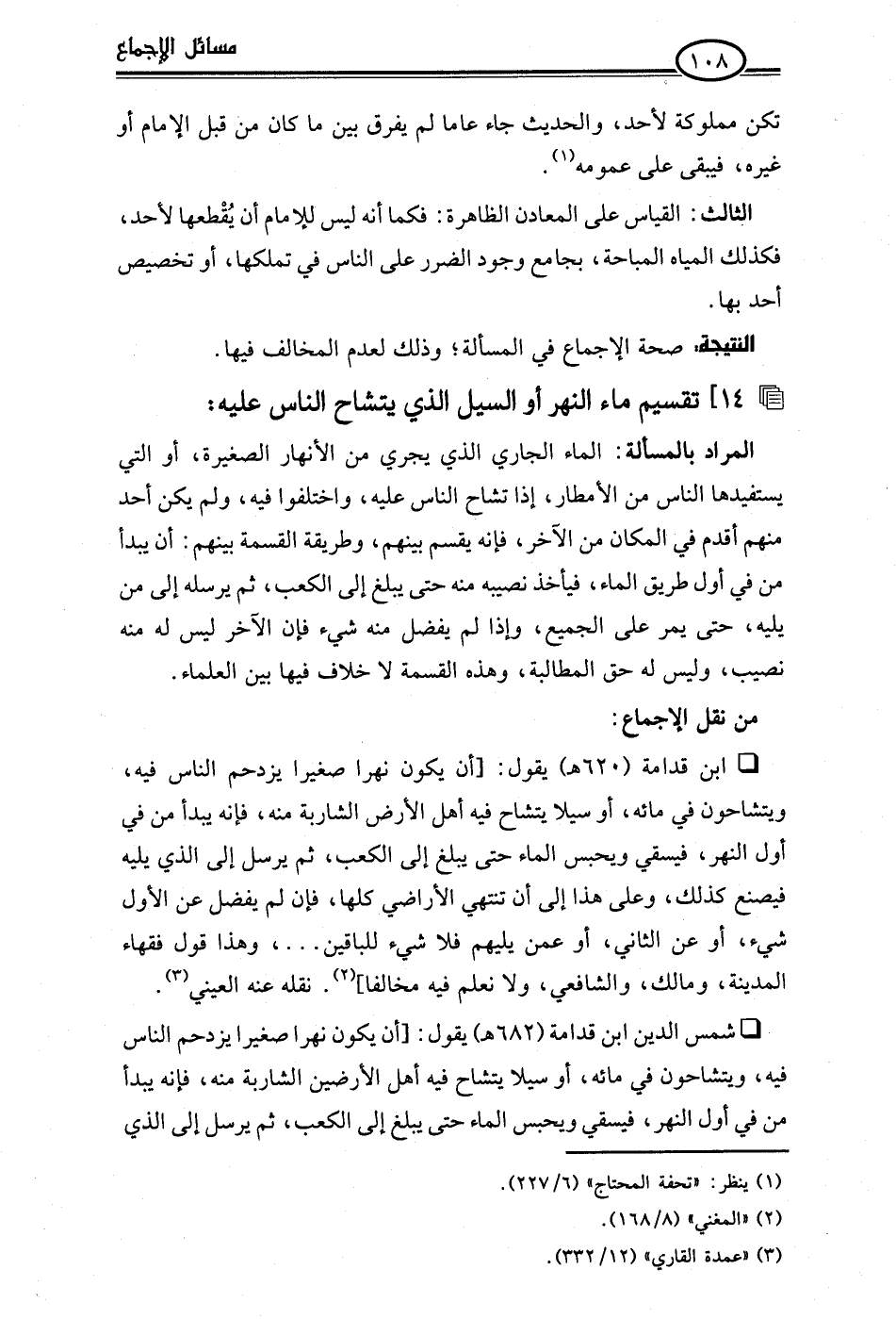 • ابن قدامة (620 هـ) يقول: [أن يكون نهرا صغيرا يزدحم الناس فيه، ويتشاحون في مائه، أو سيلا يتشاح فيه أهل الأرض الشاربة منه، فإنه يبدأ من في أول النهر، فيسقي ويحبس الماء حتى يبلغ إلى الكعب، ثم يرسل إلى الذي يليه فيصنع كذلك، وعلى هذا إلى أن تنتهي الأراضي كلها، فإن لم يفضل عن الأول شيء، أو عن الثاني، أو عمن يليهم فلا شيء للباقين. . .، وهذا قول فقهاء المدينة، ومالك، والشافعي، ولا نعلم فيه مخالفا] (¬2). نقله عنه العيني (¬3).