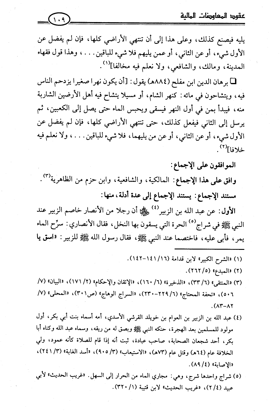 • برهان الدين ابن مفلح (884 هـ) يقول: [أن يكون نهرا صغيرا يزدحم الناس فيه، ويتشاحون في مائه: كنهر الشام، أو مسيلا يتشاح فيه أهل الأرضين الشاربة منه، فيبدأ بمن في أول النهر فيسقى ويحبس الماء حتى يصل إلى الكعبين، ثم يرسل إلى الثاني فيفعل كذلك، حتى تنتهي الأراضي كلها، فإن لم يفضل عن الأول شيء، أو عن الثاني، أو عن من يليهما، فلا شيء للباقين. . .، ولا نعلم فيه خلافا] (¬2).