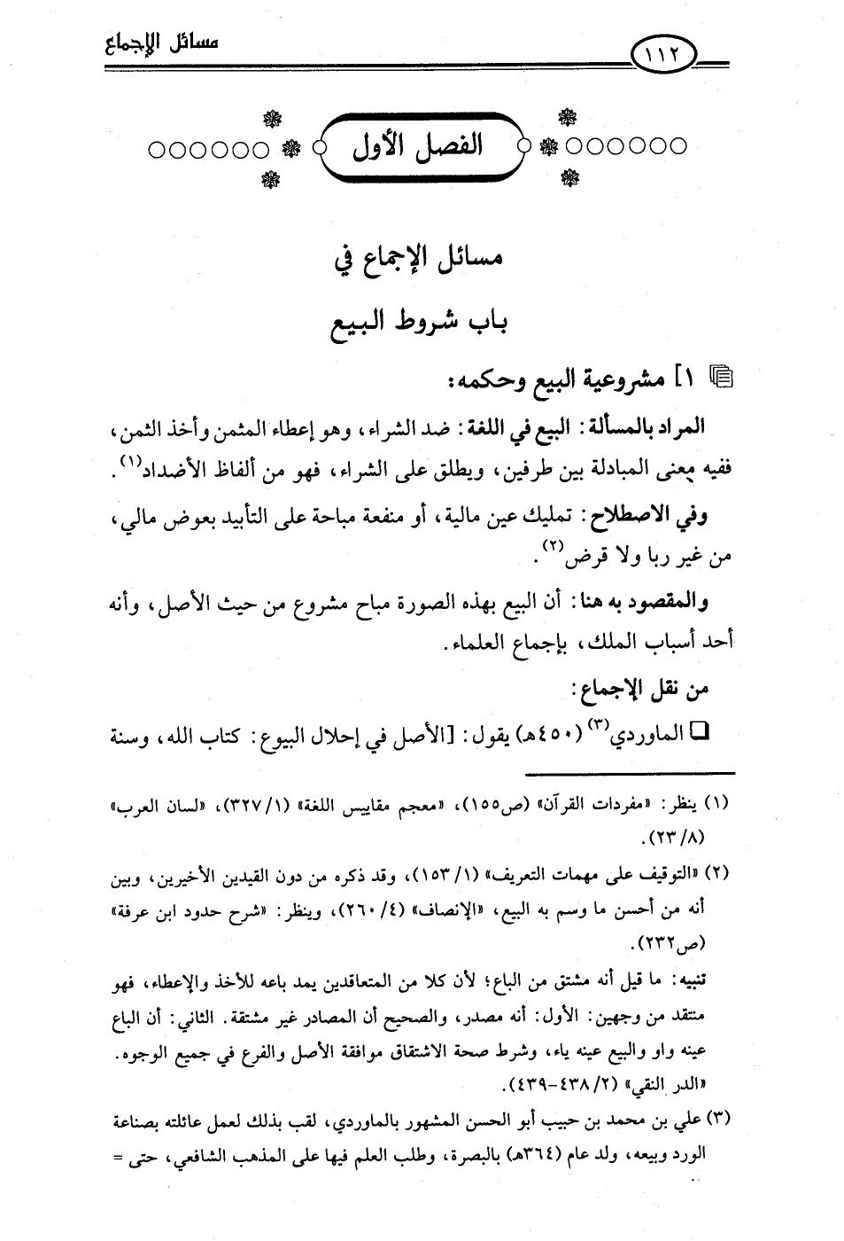 • الماوردي (¬3) (450 هـ) يقول: [الأصل في إحلال البيوع: كتاب اللَّه، وسنة