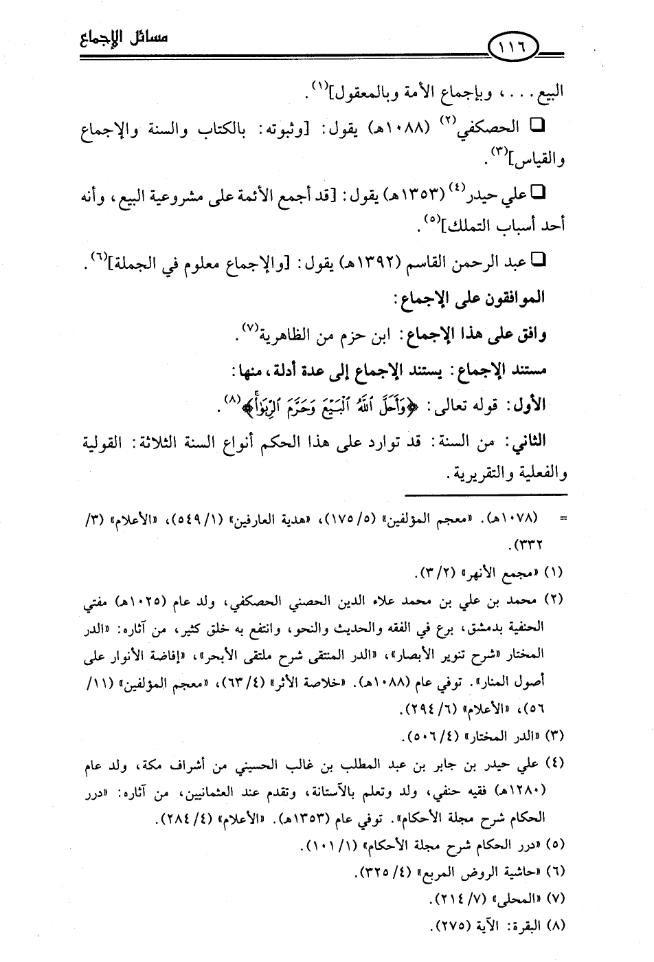 • عبد الرحمن القاسم (1392 هـ) يقول: [والإجماع معلوم في الجملة] (¬6).