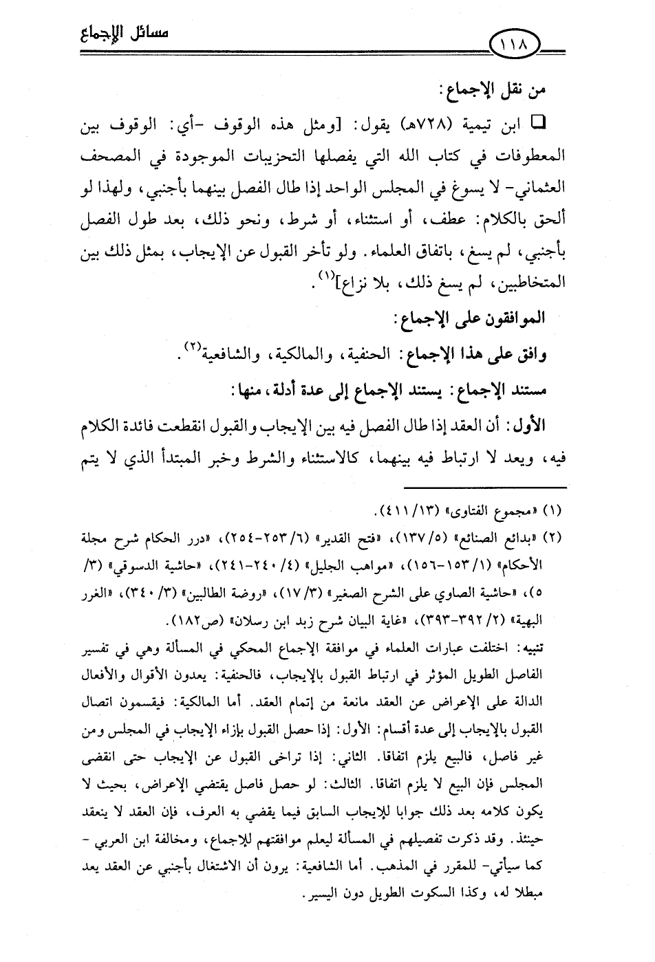 تنبيه: اختلفت عبارات العلماء في موافقة الإجماع المحكي في المسألة وهي في تفسير الفاصل الطويل المؤثر في ارتباط القبول بالإيجاب، فالحنفية: يعدون الأقوال والأفعال الدالة على الإعراض عن العقد مانعة من إتمام العقد. أما المالكية: فيقسمون اتصال القبول بالإيجاب إلى عدة أقسام: الأول: إذا حصل القبول بإزاء الايجاب في المجلس ومن غير فاصل، فالبيع يلزم اتفاقا. الثاني: إذا تراخى القبول عن الإيجاب حتى انقضى المجلس فإن البيع لا يلزم اتفاقا. الثالث: لو حصل فاصل يقتضي الإعراض، بحيث لا يكون كلامه بعد ذلك جوابا للإيجاب السابق فيما يقضي به العرف، فإن العقد لا ينعقد حينئذ. وقد ذكرت تفصيلهم في المسألة ليعلم موافقتهم للإجماع، ومخالفة ابن العربي -كما سيأتي- للمقرر في المذهب. أما الشافعية: يرون أن الاشتغال بأجنبي عن العقد يعد مبطلا له، وكذا السكوت الطويل دون اليسير.