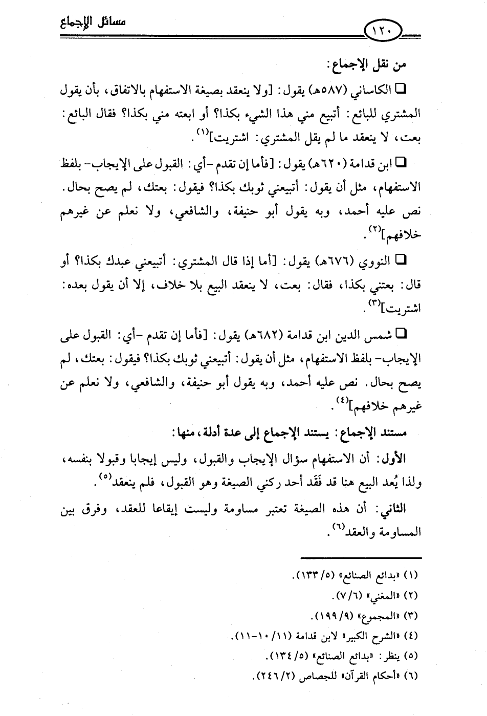 • ابن قدامة (620 هـ) يقول: [فأما إن تقدم -أي: القبول على الإيجاب- بلفظ الاستفهام، مثل أن يقول: أتبيعني ثوبك بكذا؟ فيقول: بعتك، لم يصح بحال. نص عليه أحمد، وبه يقول أبو حنيفة، والشافعي، ولا نعلم عن غيرهم خلافهم] (¬2).