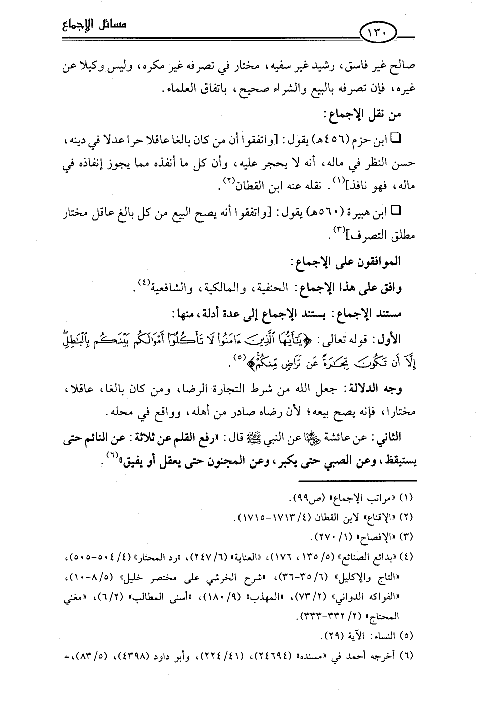 • ابن حزم (456 هـ) يقول: [واتفقوا أن من كان بالغا عاقلا حرا عدلا في دينه، حسن النظر في ماله، أنه لا يحجر عليه، وأن كل ما أنفذه مما يجوز إنفاذه في ماله، فهو نافذ] (¬1). نقله عنه ابن القطان (¬2).