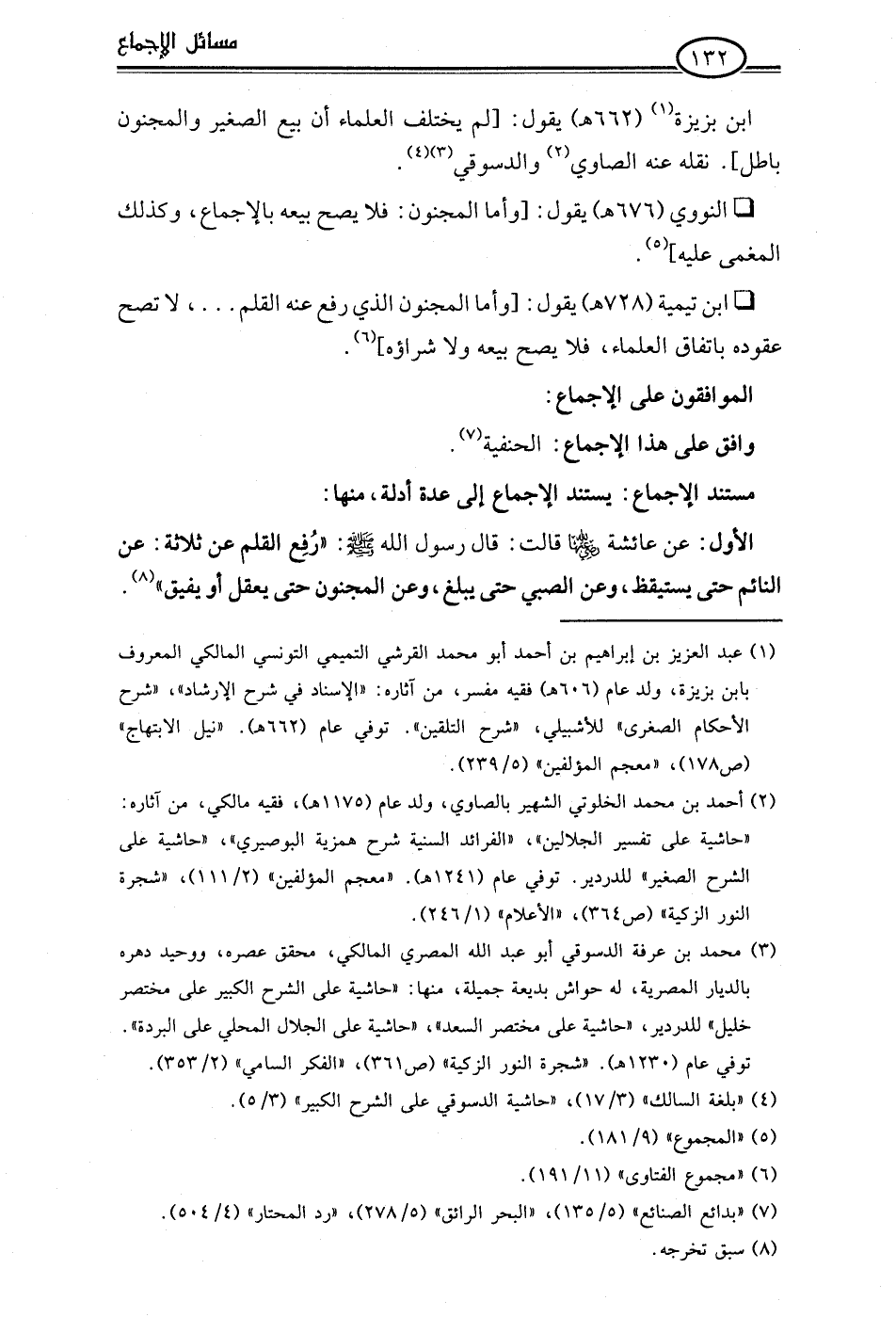 • ابن تيمية (728 هـ) يقول: [وأما المجنون الذي رفع عنه القلم. . .، لا تصح عقوده باتفاق العلماء، فلا يصح بيعه ولا شراؤه] (¬6).