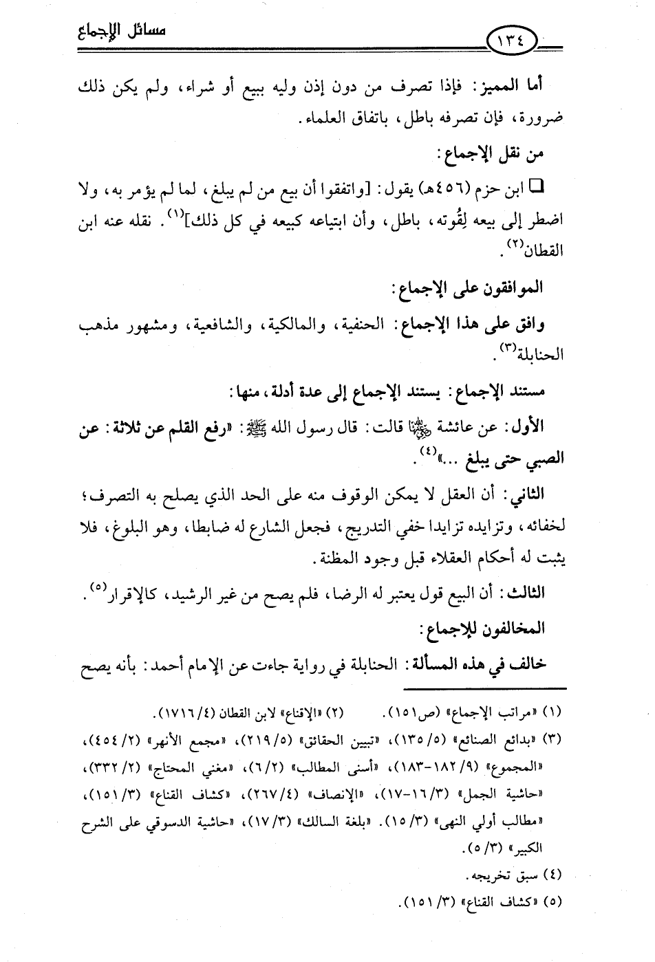 • ابن حزم (456 هـ) يقول: [واتفقوا أن بيع من لم يبلغ، لما لم يؤمر به، ولا اضطر إلى بيعه لِقُوته، باطل، وأن ابتياعه كبيعه في كل ذلك] (¬1). نقله عنه ابن القطان (¬2).