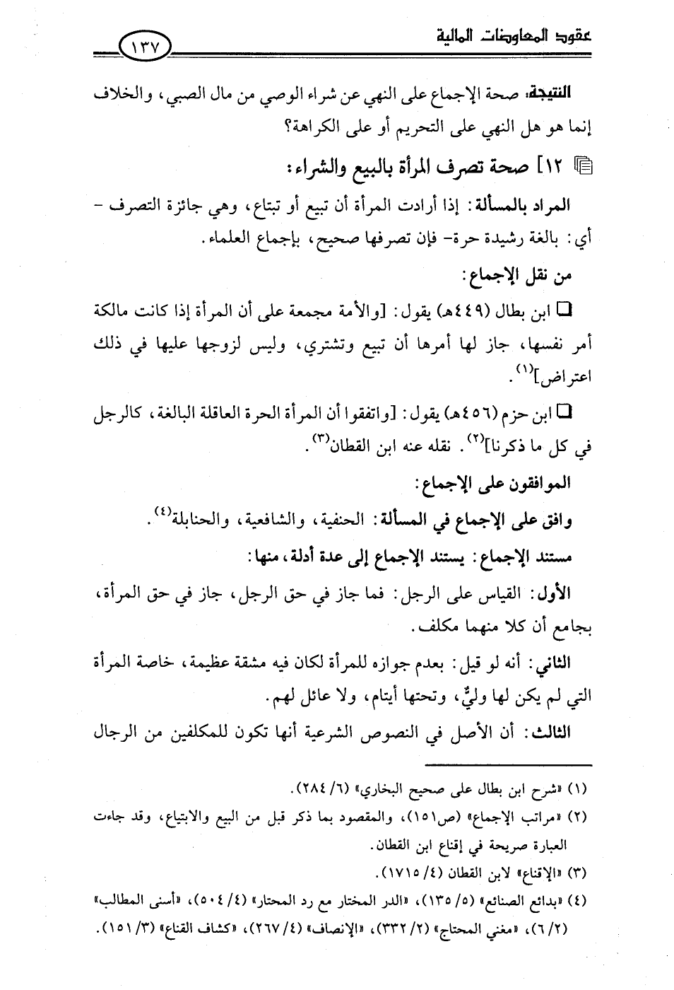 • ابن بطال (449 هـ) يقول: [والأمة مجمعة على أن المرأة إذا كانت مالكة أمر نفسها، جاز لها أمرها أن تبيع وتشتري، وليس لزوجها عليها في ذلك اعتراض] (¬1).