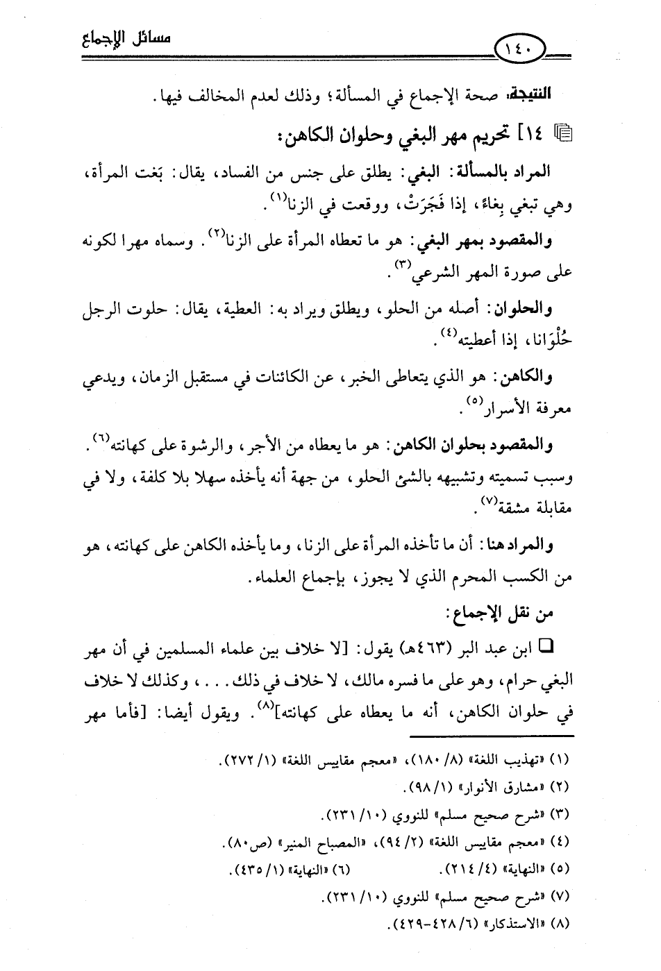 • ابن عبد البر (463 هـ) يقول: [لا خلاف بين علماء المسلمين في أن مهر البغي حرام، وهو على ما فسره مالك، لا خلاف في ذلك. . .، وكذلك لا خلاف في حلوان الكاهن، أنه ما يعطاه على كهانته] (¬8). ويقول أيضا: [فأما مهر