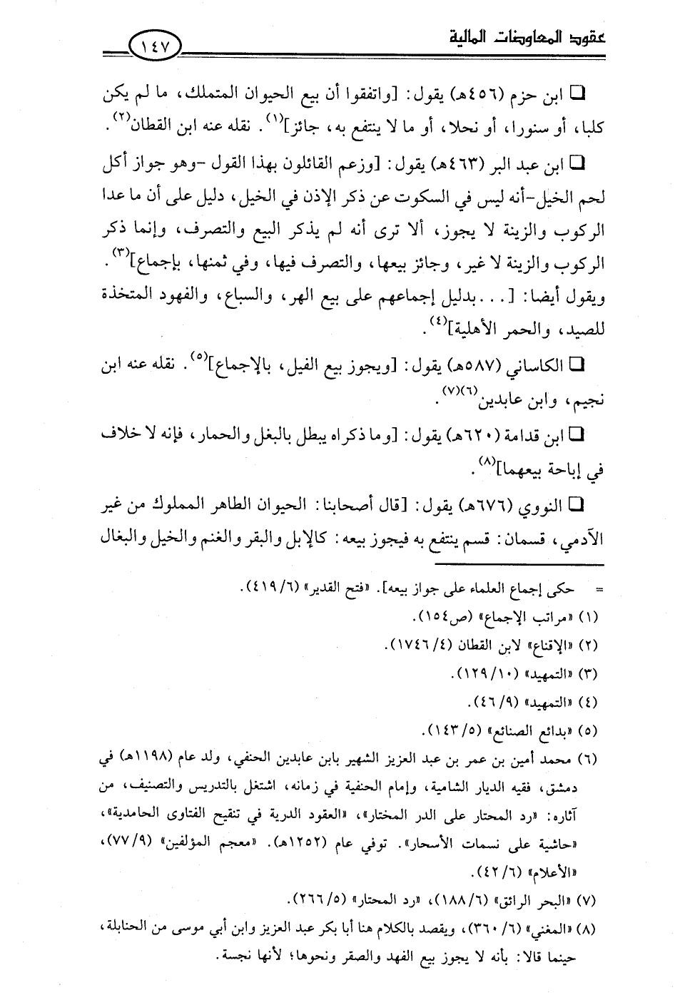 • ابن عبد البر (463 هـ) يقول: [وزعم القائلون بهذا القول -وهو جواز أكل لحم الخيل- أنه ليس في السكوت عن ذكر الإذن في الخيل، دليل على أن ما عدا الركوب والزينة لا يجوز، ألا ترى أنه لم يذكر البيع والتصرف، وإنما ذكر الركوب والزينة لا غير، وجائز بيعها، والتصرف فيها، وفي ثمنها، بإجماع] (¬3). ويقول أيضا: [. . . بدليل إجماعهم على بيع الهر، والسباع، والفهود المتخذة للصيد، والحمر الأهلية] (¬4).