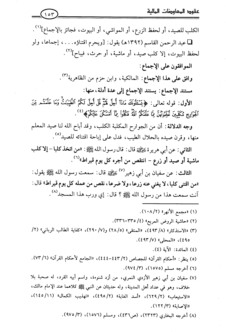 • عبد الرحمن القاسم (1392 هـ) يقول: [ويحرم اقتناؤه. . .، إجماعا، ولو لحفظ البيوت، إلا كلب صيد، أو ماشية، أو حرث، فيباح] (¬2).