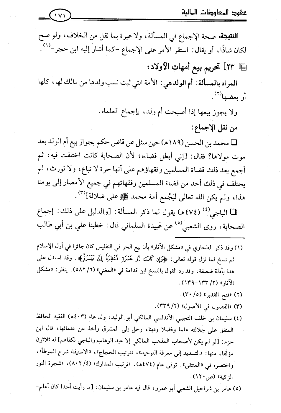 • الباجي (¬4) (474 هـ) يقول لما ذكر المسألة: [والدليل على ذلك: إجماع الصحابة، روى الشعبي (¬5) عن عَبيدة السلماني قال: خطبنا علي بن أبي طالب