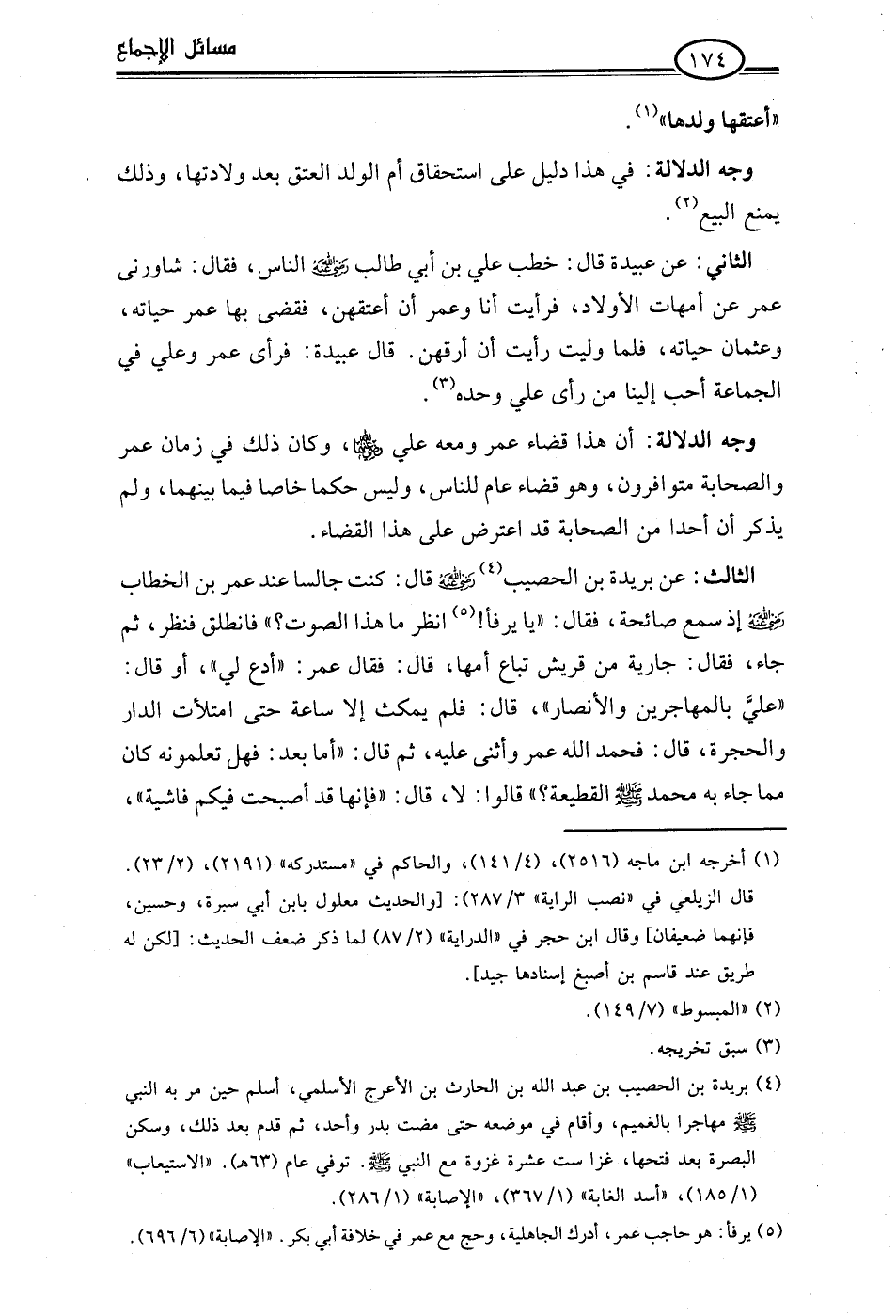 الثاني: عن عبيدة قال: خطب علي بن أبي طالب -رضي اللَّه عنه- الناس، فقال: شاورني عمر عن أمهات الأولاد، فرأيت أنا وعمر أن أعتقهن، فقضى بها عمر حياته، وعثمان حياته، فلما وليت رأيت أن أرقهن. قال عبيدة: فرأى عمر وعلي في الجماعة أحب إلينا من رأى علي وحده (¬3).