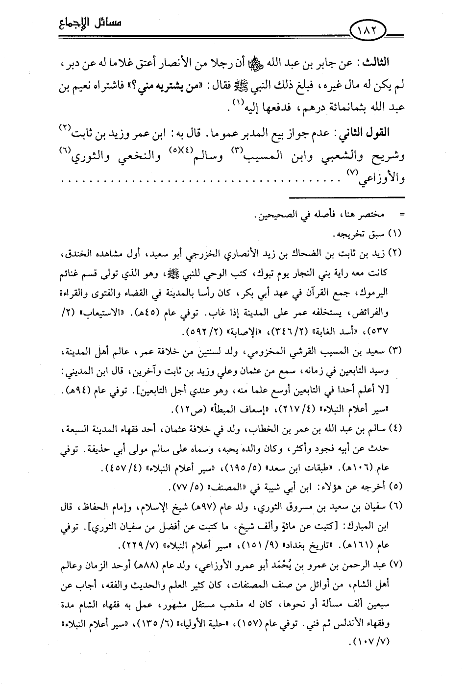 (¬7) عبد الرحمن بن عمرو بن يُحْمَد أبو عمرو الأوزاعي، ولد عام (88 هـ) أوحد الزمان وعالم أهل الشام، من أوائل من صنف المصنفات، كان كثير العلم والحديث والفقه، أجاب عن سبعين ألف مسألة أو نحوها، كان له مذهب مستقل مشهور، عمل به فقهاء الشام مدة وفقهاء الأندلس ثم فني. توفي عام (157)، "حلية الأولياء" (6/ 135)، "سير أعلام النبلاء" (7/ 107).