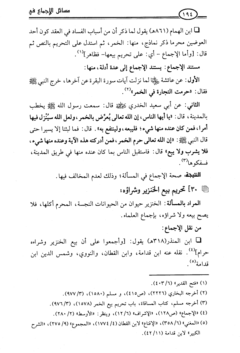 • ابن الهمام (861 هـ) يقول لما ذكر أن من أسباب الفساد في العقد كون أحد العوضين محرما ذكر نماذج، منها: الخمر، ثم استدل على التحريم بالنص ثم قال: [وأما الإجماع -أي: على تحريم بيعها- فظاهر] (¬1).