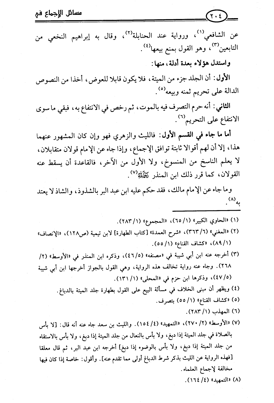 (¬7) "الأوسط" (2/ 270)، "التمهيد" (4/ 154). والليث بن سعد جاء عنه أنه قال: [لا بأس بالصلاة في جلد الميتة إذا دبغ، ولا بأس بالنعال من جلد الميتة إذا دبغ، ولا بأس بالاستقاء من جلد الميتة إذا دبغ، ولا بأس بالوضوء إذا دبغ] أخرجه ابن عبد البر، ثم قال معلقا [فهذه الرواية عن الليث بذكر شرط الدباغ أولى مما تقدم عنه]. وأقول: خاصة إذا كان فيها مخالفة لإجماع العلماء.