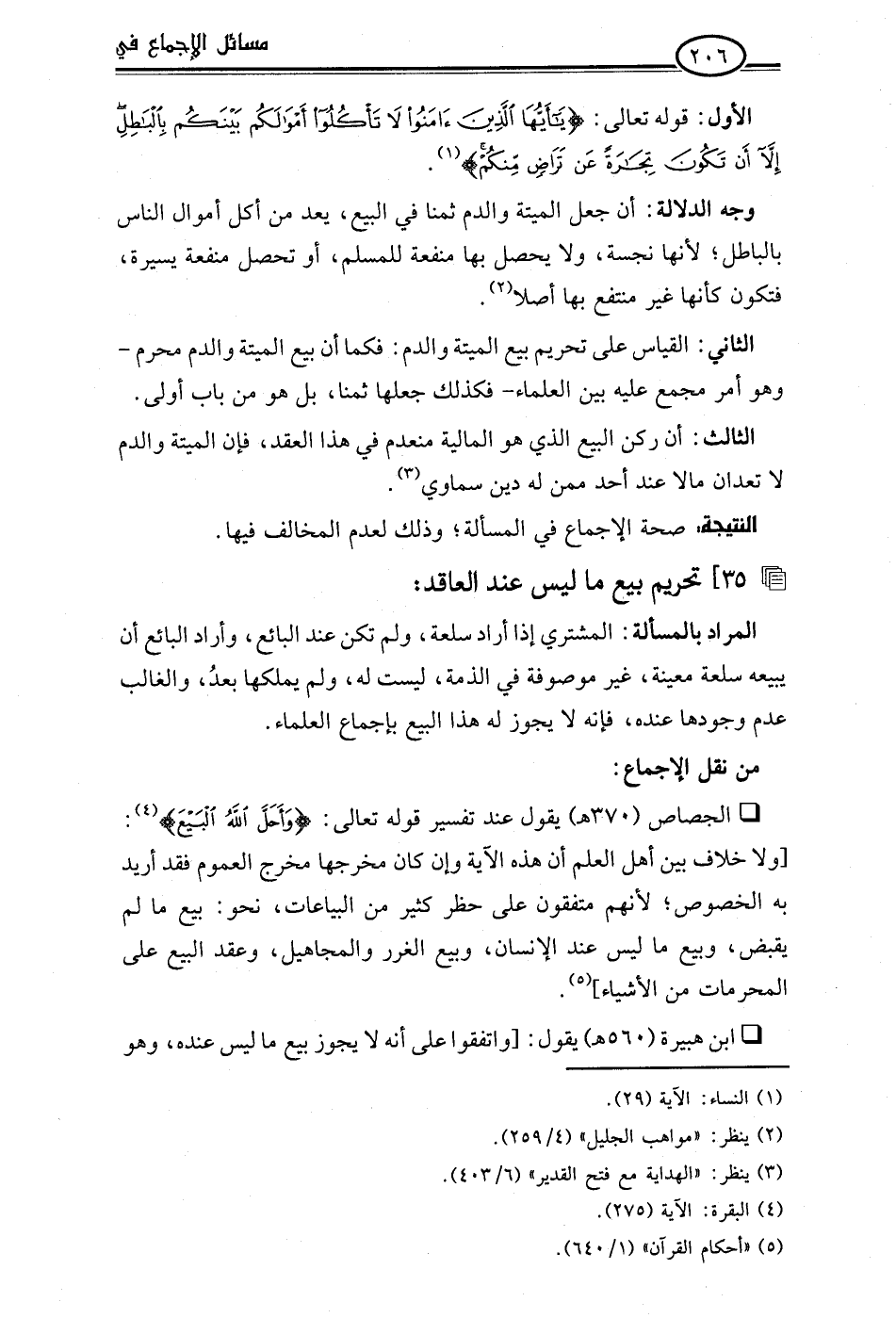 • الجصاص (370 هـ) يقول عند تفسير قوله تعالى: {وَأَحَلَّ اللَّهُ الْبَيْعَ} (¬4): [ولا خلاف بين أهل العلم أن هذه الآية وإن كان مخرجها مخرج العموم فقد أريد به الخصوص؛ لأنهم متفقون على حظر كثير من البياعات، نحو: بيع ما لم يقبض، وبيع ما ليس عند الإنسان، وبيع الغرر والمجاهيل، وعقد البيع على المحرمات من الأشياء] (¬5).