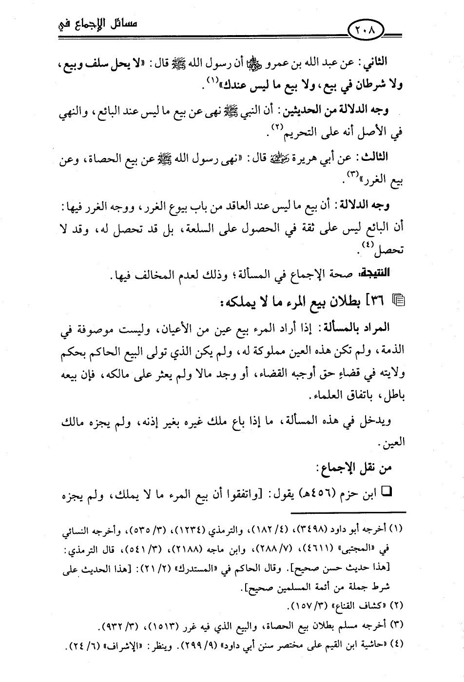 • ابن حزم (456 هـ) يقول: [واتفقوا أن بيع المرء ما لا يملك، ولم يجزه