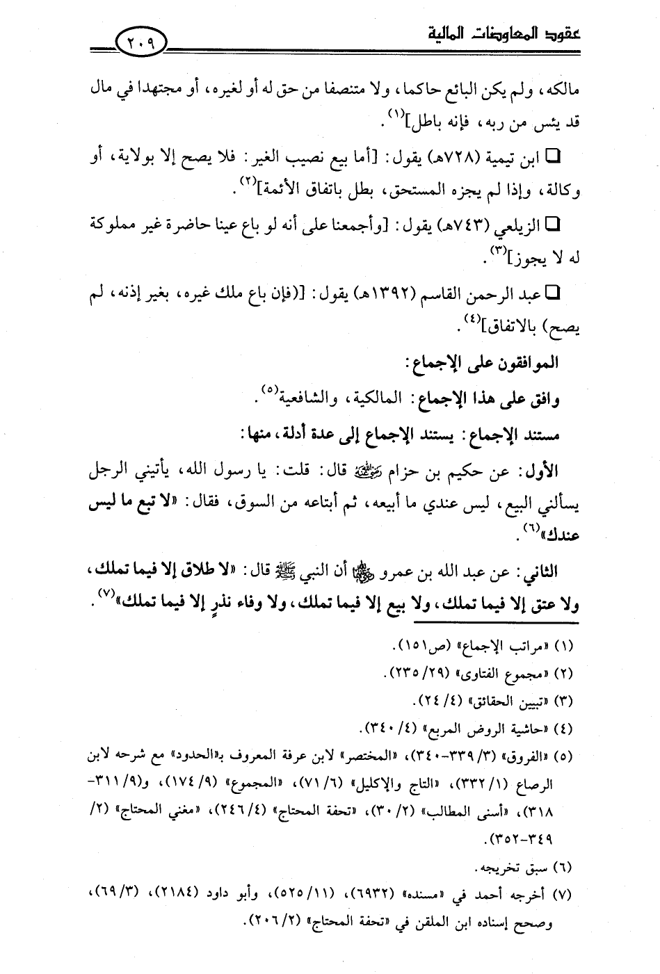 • الزيلعي (743 هـ) يقول: [وأجمعنا على أنه لو باع عينا حاضرة غير مملوكة له لا يجوز] (¬3).