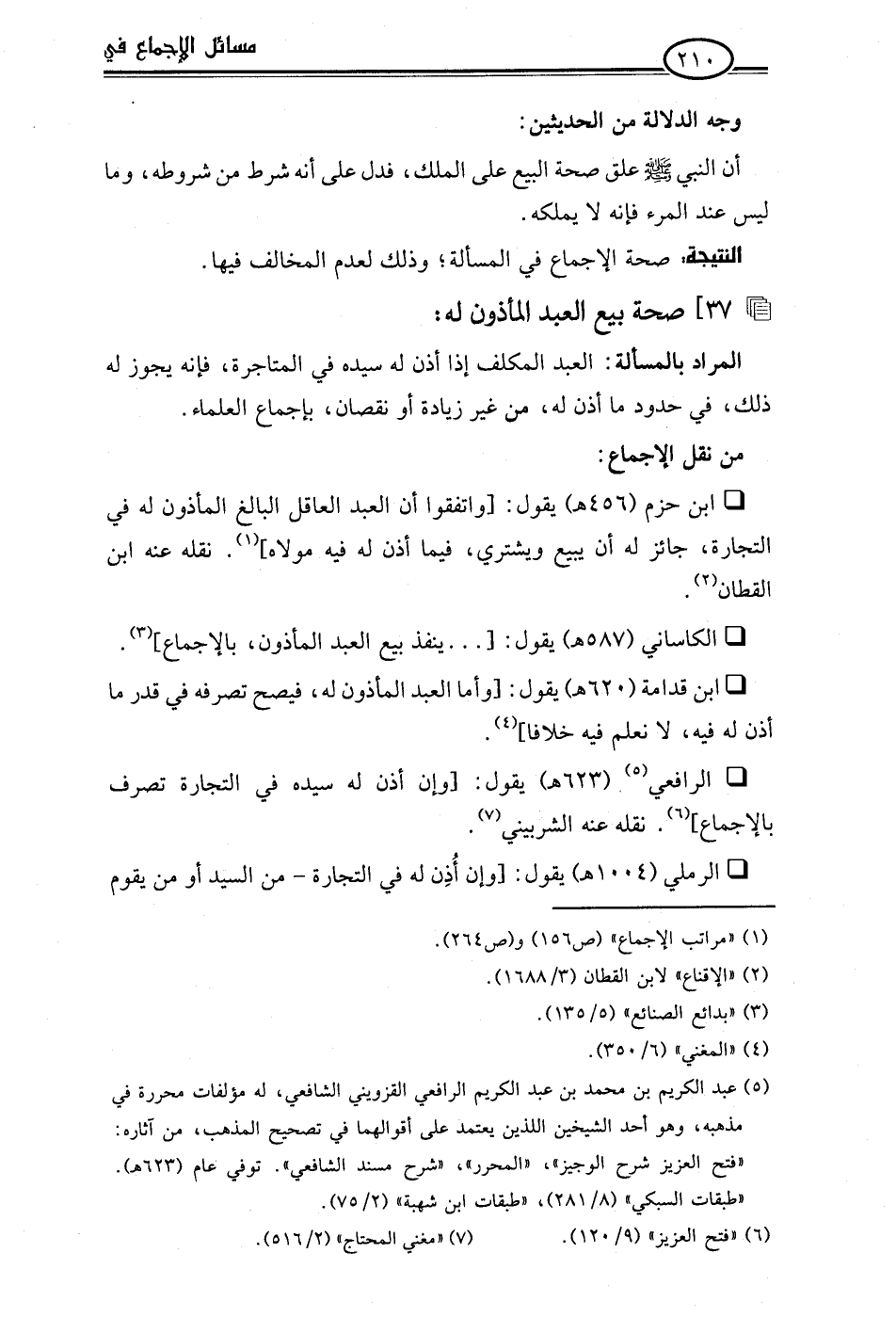 • ابن حزم (456 هـ) يقول: [واتفقوا أن العبد العاقل البالغ المأذون له في التجارة، جائز له أن يبيع ويشتري، فيما أذن له فيه مولاه] (¬1). نقله عنه ابن القطان (¬2).
