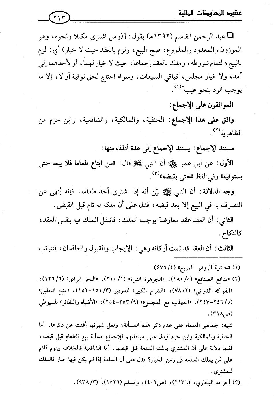 • عبد الرحمن القاسم (1392 هـ) يقول: [(ومن اشترى مكيلا ونحوه، وهو الموزون والمعدود والمذروع، صح البيع، ولزم بالعقد حيث لا خيار) أي: لزم بالبيع؛ لتمام شروطه، وملك بالعقد إجماعا، حيث لا خيار لهما، أو لأحدهما إلى أمد، ولا خيار مجلس، كباقي المبيعات، وسواء احتاج لحق توفية أو لا، إلا ما يوجب الرد بنحو عيب] (¬1).