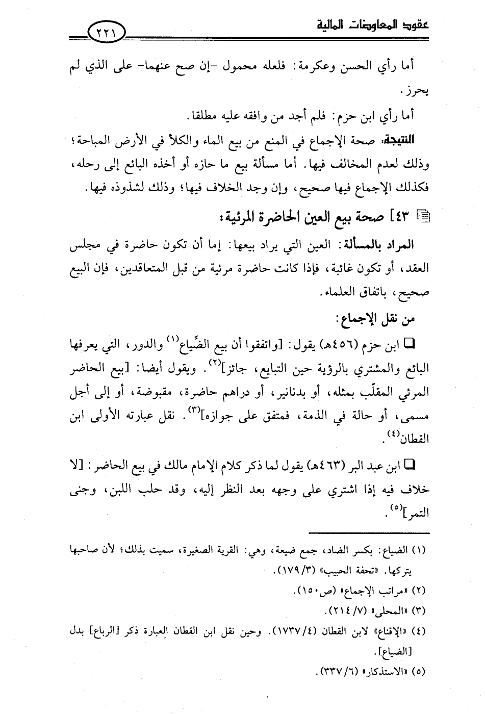 • ابن حزم (456 هـ) يقول: [واتفقوا أن بيع الضِّياع (¬1) والدور، التي يعرفها البائع والمشتري بالرؤية حين التبايع، جائز] (¬2). ويقول أيضا: [بيع الحاضر المرئي المقلّب بمثله، أو بدنانير، أو دراهم حاضرة، مقبوضة، أو إلى أجل مسمى، أو حالة في الذمة، فمتفق على جوازه] (¬3). نقل عبارته الأولى ابن القطان (¬4).