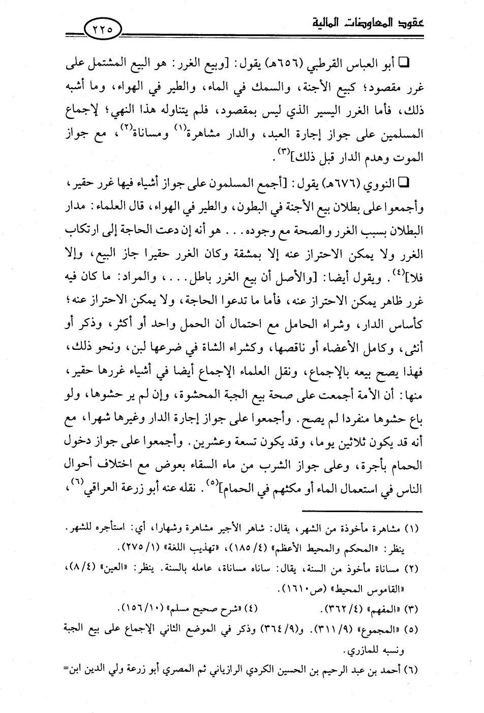 • النووي (676 هـ) يقول: [أجمع المسلمون على جواز أشياء فيها غرر حقير، وأجمعوا على بطلان بيع الأجنة في البطون، والطير في الهواء، قال العلماء: مدار البطلان بسبب الغرر والصحة مع وجوده. . . هو أنه إن دعت الحاجة إلى ارتكاب الغرر ولا يمكن الاحتراز عنه إلا بمشقة وكان الغرر حقيرا جاز البيع، وإلا فلا] (¬4). ويقول أيضا: [والأصل أن بيع الغرر باطل. . .، والمراد: ما كان فيه غرر ظاهر يمكن الاحتراز عنه، فأما ما تدعوا الحاجة، ولا يمكن الاحتراز عنه؛ كأساس الدار، وشراء الحامل مع احتمال أن الحمل واحد أو أكثر، وذكر أو أنثى، وكامل الأعضاء أو ناقصها، وكشراء الشاة في ضرعها لبن، ونحو ذلك، فهذا يصح بيعه بالإجماع، ونقل العلماء الإجماع أيضا في أشياء غررها حقير، منها: أن الأمة أجمعت على صحة بيع الجبة المحشوة، وإن لم ير حشوها، ولو باع حشوها منفردا لم يصح. وأجمعوا على جواز إجارة الدار وغيرها شهرا، مع أنه قد يكون ثلاثين يوما، وقد يكون تسعة وعشرين. وأجمعوا على جواز دخول الحمام بأجرة، وعلى جواز الشرب من ماء السقاء بعوض مع اختلاف أحوال الناس في استعمال الماء أو مكثهم في الحمام] (¬5). نقله عنه أبو زرعة العراقي (¬6)،