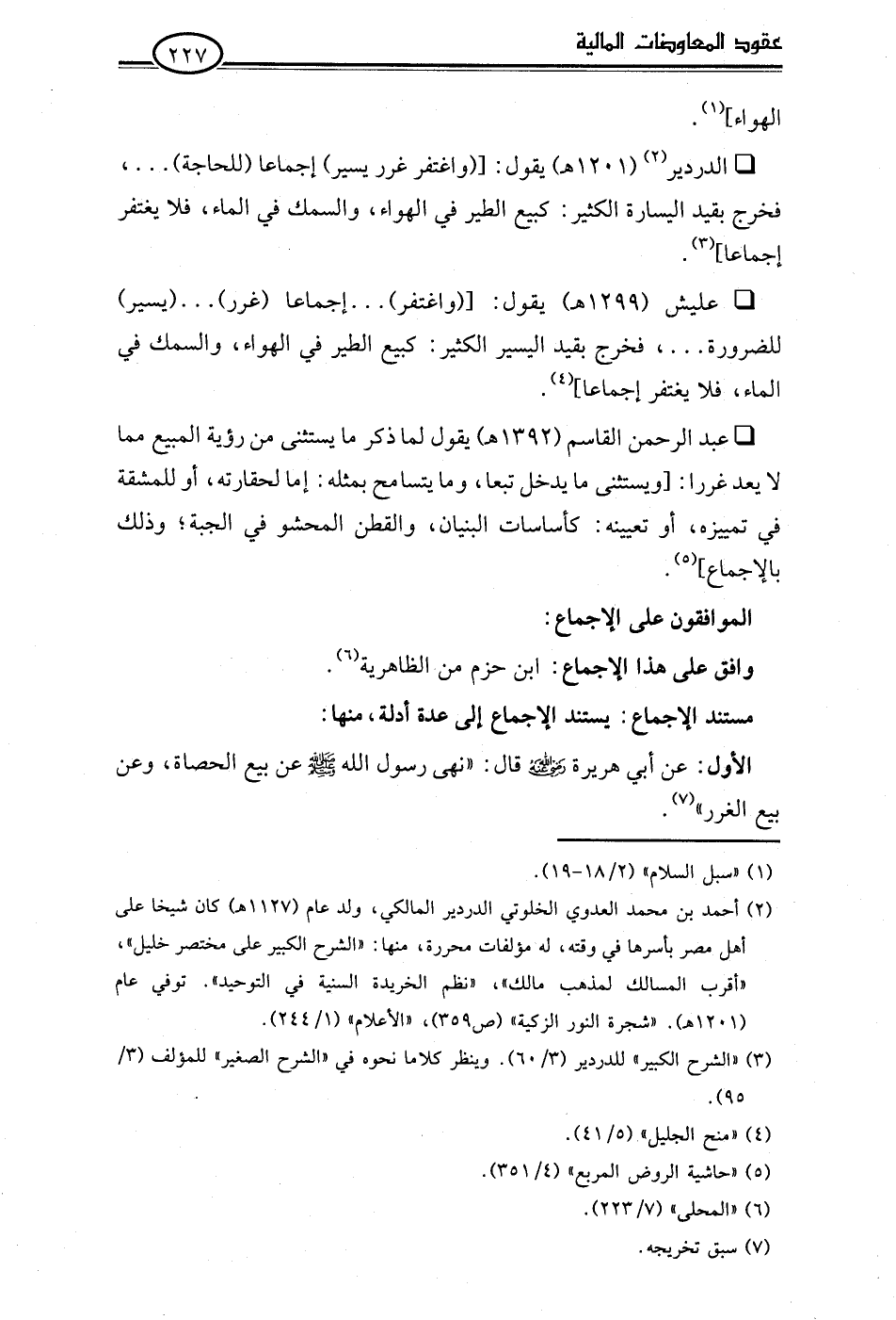• الدردير (¬2) (1201 هـ) يقول: [(واغتفر غرر يسير) إجماعا (للحاجة). . .، فخرج بقيد اليسارة الكثير: كبيع الطير في الهواء، والسمك في الماء، فلا يغتفر إجماعا] (¬3).