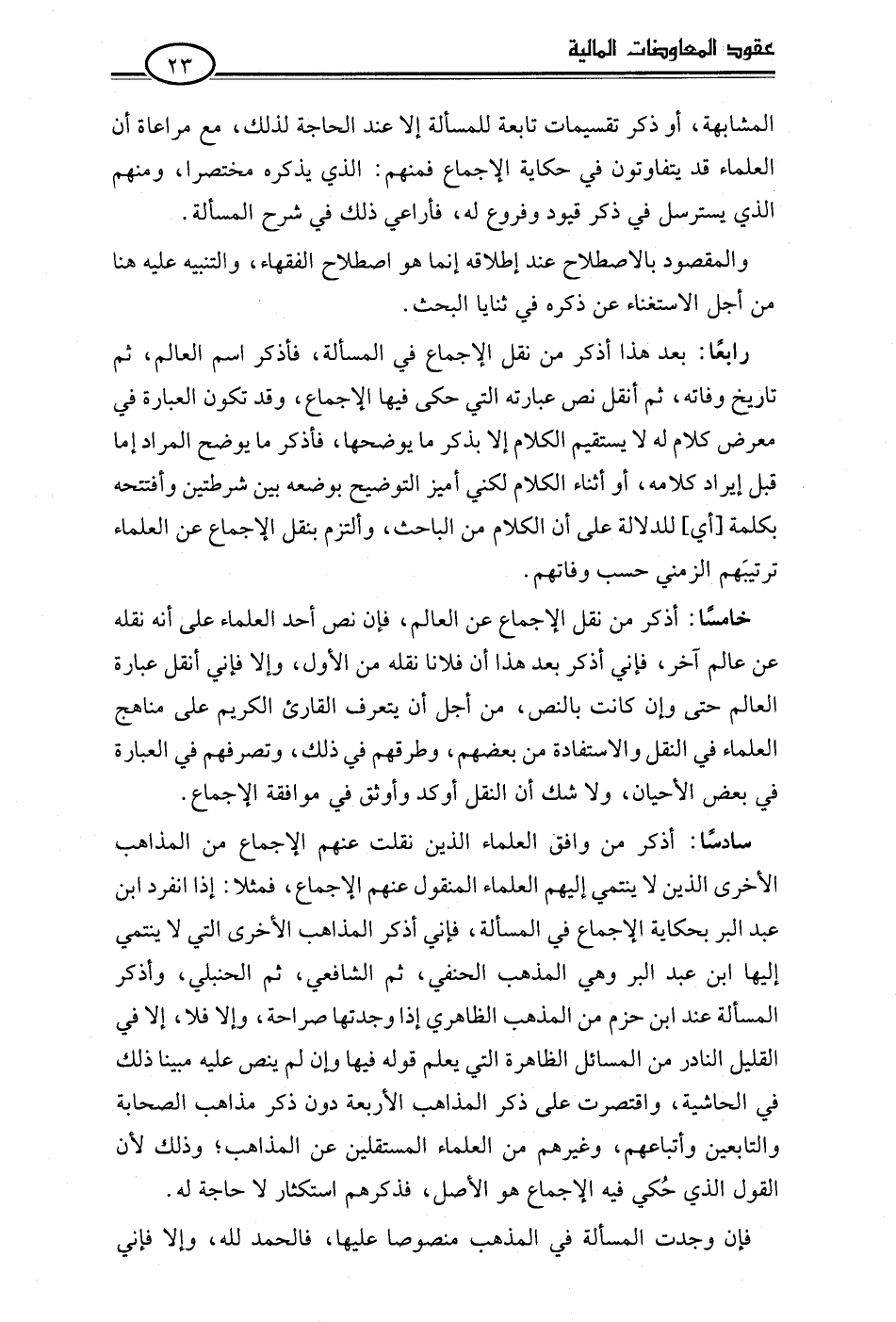 خامسًا: أذكر من نقل الإجماع عن العالم، فإن نص أحد العلماء على أنه نقله عن عالم آخر، فإني أذكر بعد هذا أن فلانا نقله من الأول، وإلا فإني أنقل عبارة العالم حتى وإن كانت بالنص، من أجل أن يتعرف القارئ الكريم على مناهج العلماء في النقل والاستفادة من بعضهم، وطرقهم في ذلك، وتصرفهم في العبارة في بعض الأحيان، ولا شك أن النقل أوكد وأوثق في موافقة الإجماع.