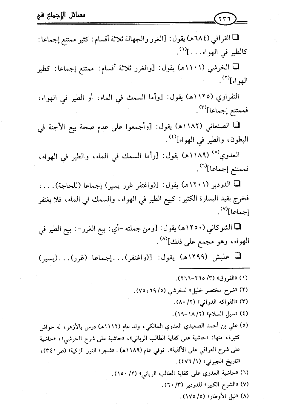 • الخرشي (1101 هـ) يقول: [والغرر ثلاثة أقسام: ممتنع إجماعا: كطير الهواء] (¬2).