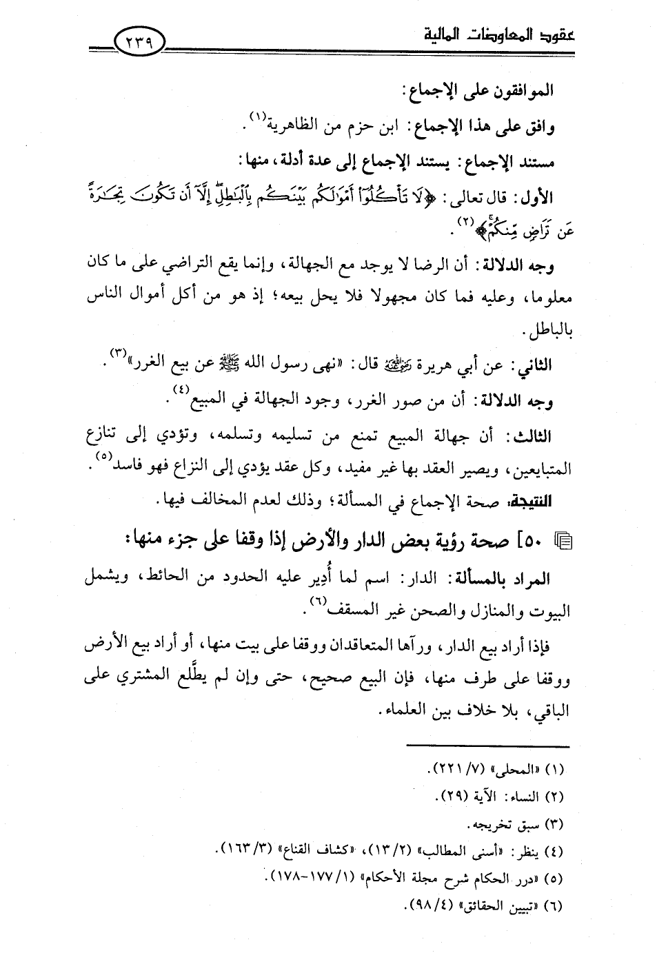 الثالث: أن جهالة المبيع تمنع من تسليمه وتسلمه، وتؤدي إلى تنازع المتبايعين، ويصير العقد بها غير مفيد، وكل عقد يؤدي إلى النزاع فهو فاسد (¬5).Rصحة الإجماع في المسألة؛ وذلك لعدم المخالف فيها.