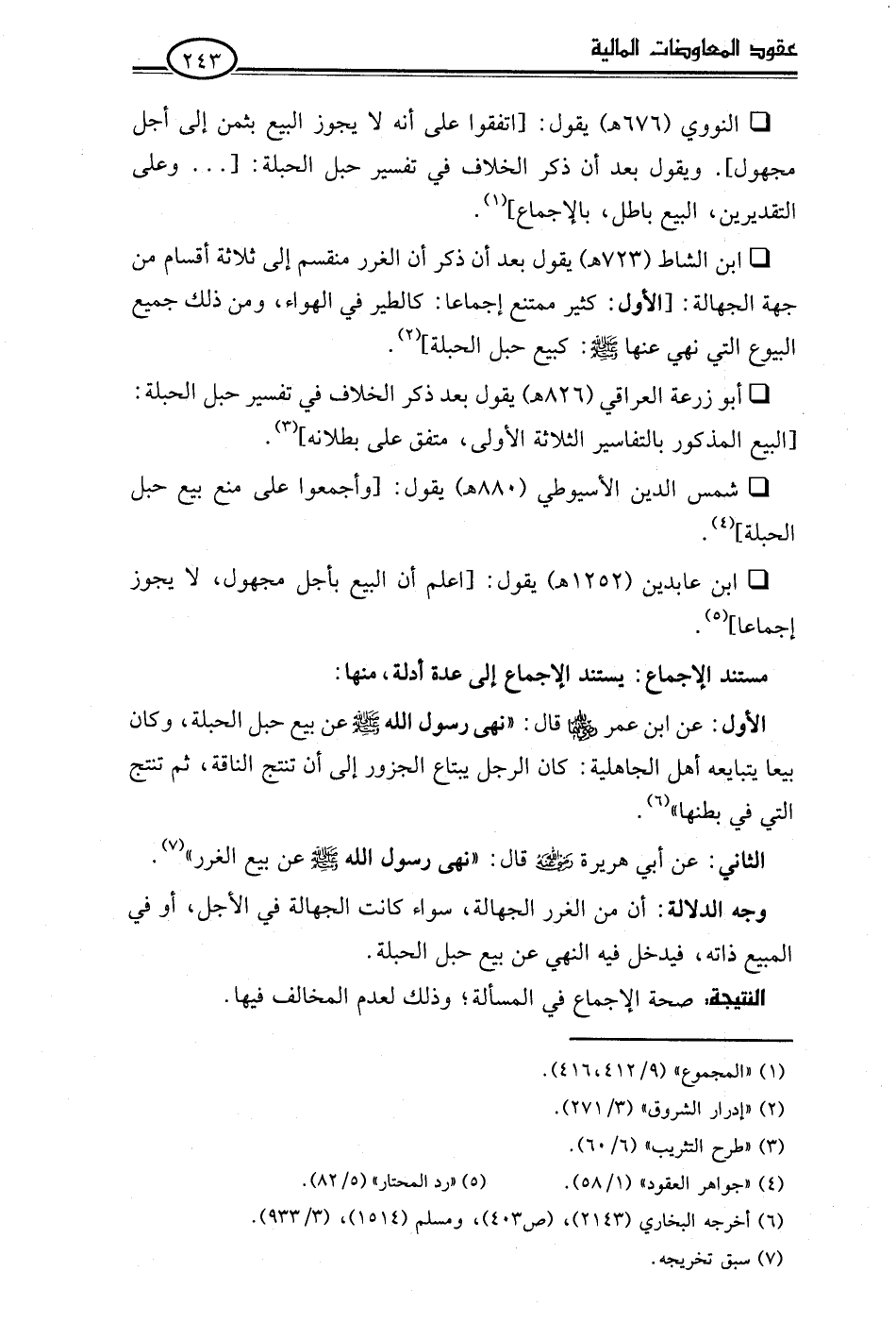 • النووي (676 هـ) يقول: [اتفقوا على أنه لا يجوز البيع بثمن إلى أجل مجهول]. ويقول بعد أن ذكر الخلاف في تفسير حبل الحبلة: [. . . وعلى التقديرين، البيع باطل، بالإجماع] (¬1).