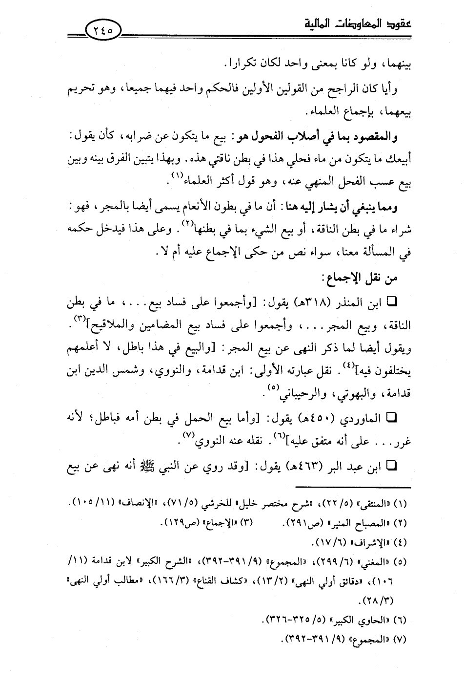 • ابن المنذر (318 هـ) يقول: [وأجمعوا على فساد بيع. . .، ما في بطن الناقة، وبيع المجر. . .، وأجمعوا على فساد بيع المضامين والملاقيح] (¬3).