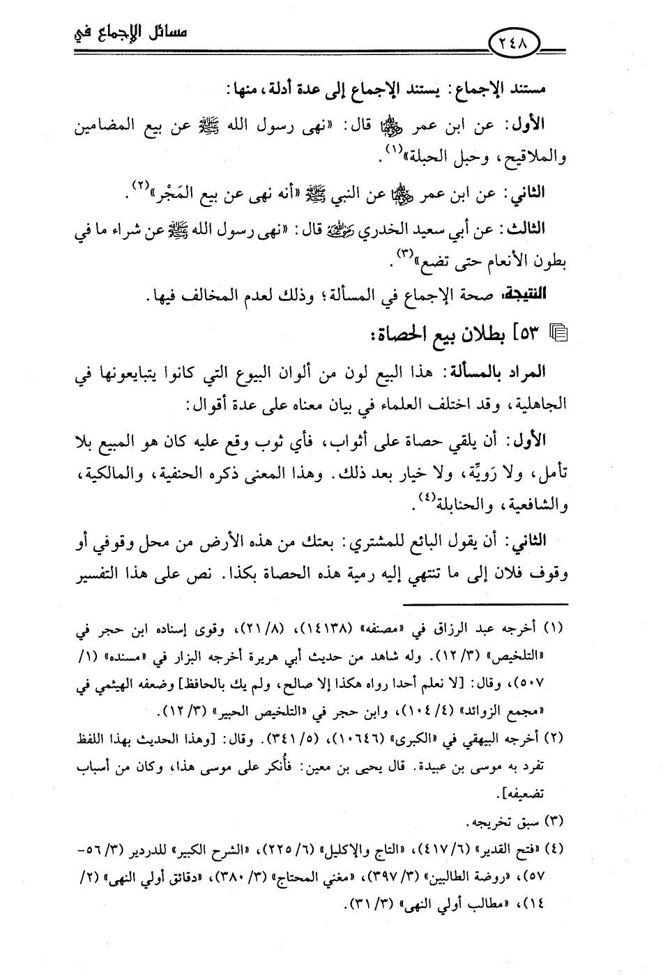 الثالث: عن أبي سعيد الخدري -رضي اللَّه عنه- قال: "نهى رسول اللَّه -صلى اللَّه عليه وسلم- عن شراء ما في بطون الأنعام حتى تضع" (¬3).Rصحة الإجماع في المسألة؛ وذلك لعدم المخالف فيها.