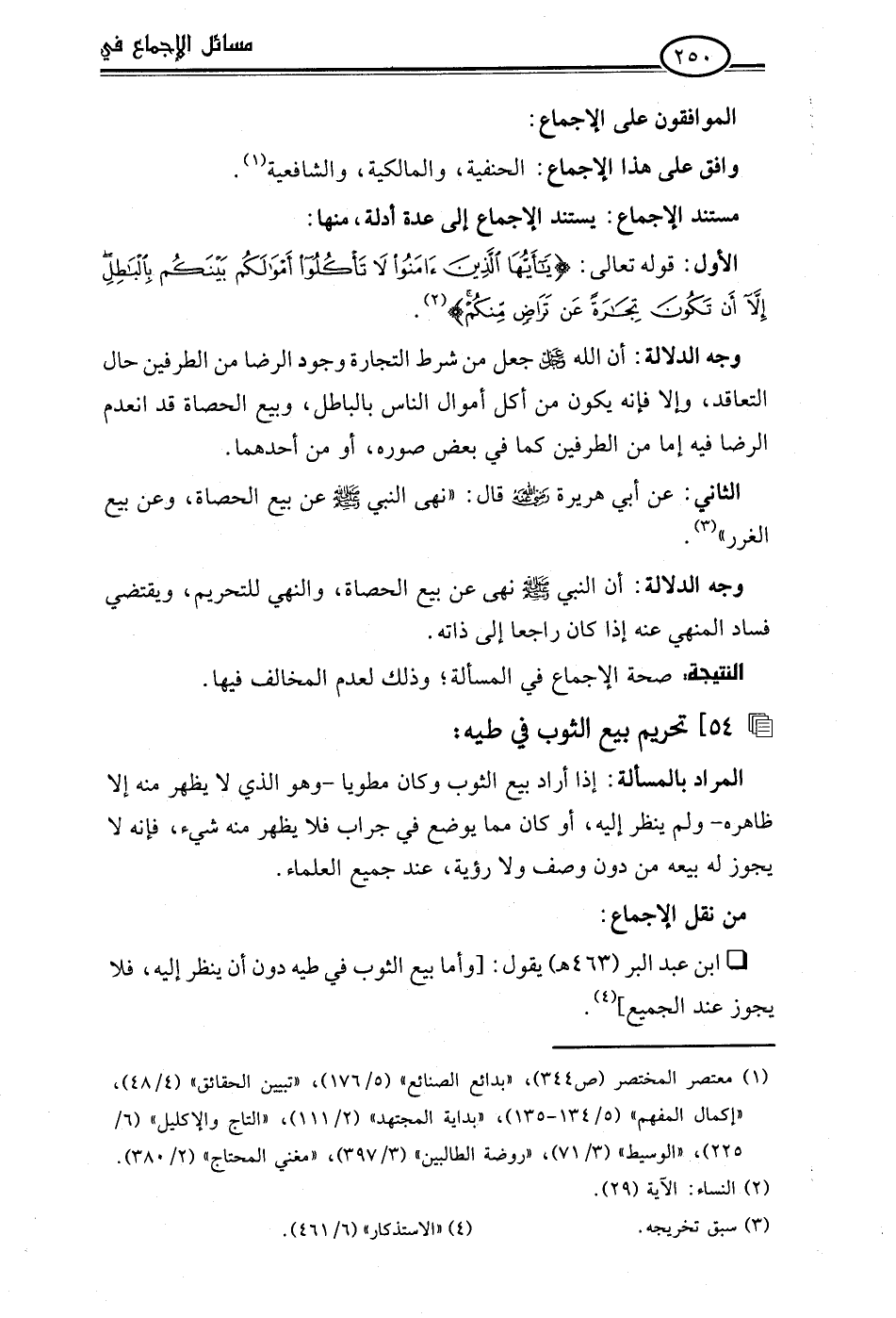 • ابن عبد البر (463 هـ) يقول: [وأما بيع الثوب في طيه دون أن ينظر إليه، فلا يجوز عند الجميع] (¬4).
