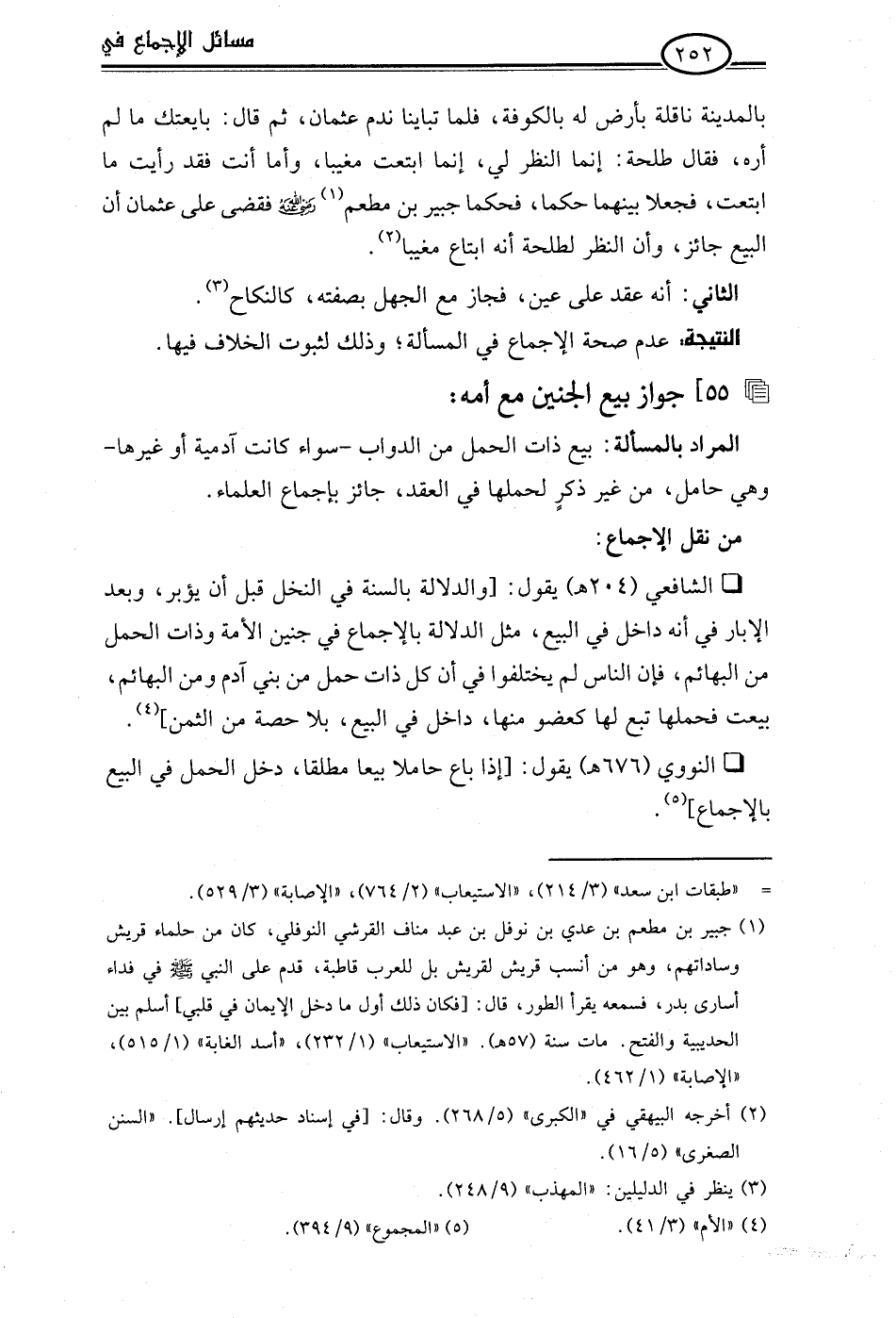 • الشافعي (204 هـ) يقول: [والدلالة بالسنة في النخل قبل أن يؤبر، وبعد الإبار في أنه داخل في البيع، مثل الدلالة بالإجماع في جنين الأمة وذات الحمل من البهائم، فإن الناس لم يختلفوا في أن كل ذات حمل من بني آدم ومن البهائم، بيعت فحملها تبع لها كعضو منها، داخل في البيع، بلا حصة من الثمن] (¬4).