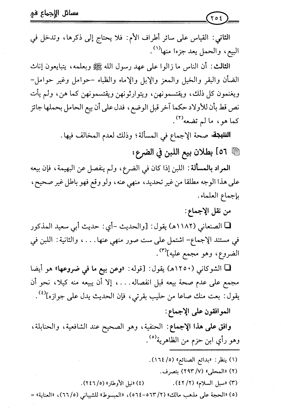 • الصنعاني (1182 هـ) يقول: [والحديث -أي: حديث أبي سعيد المذكور في مستند الإجماع- اشتمل على ست صور منهي عنها. . .، والثانية: اللبن في الضروع، وهو مجمع عليه] (¬3).