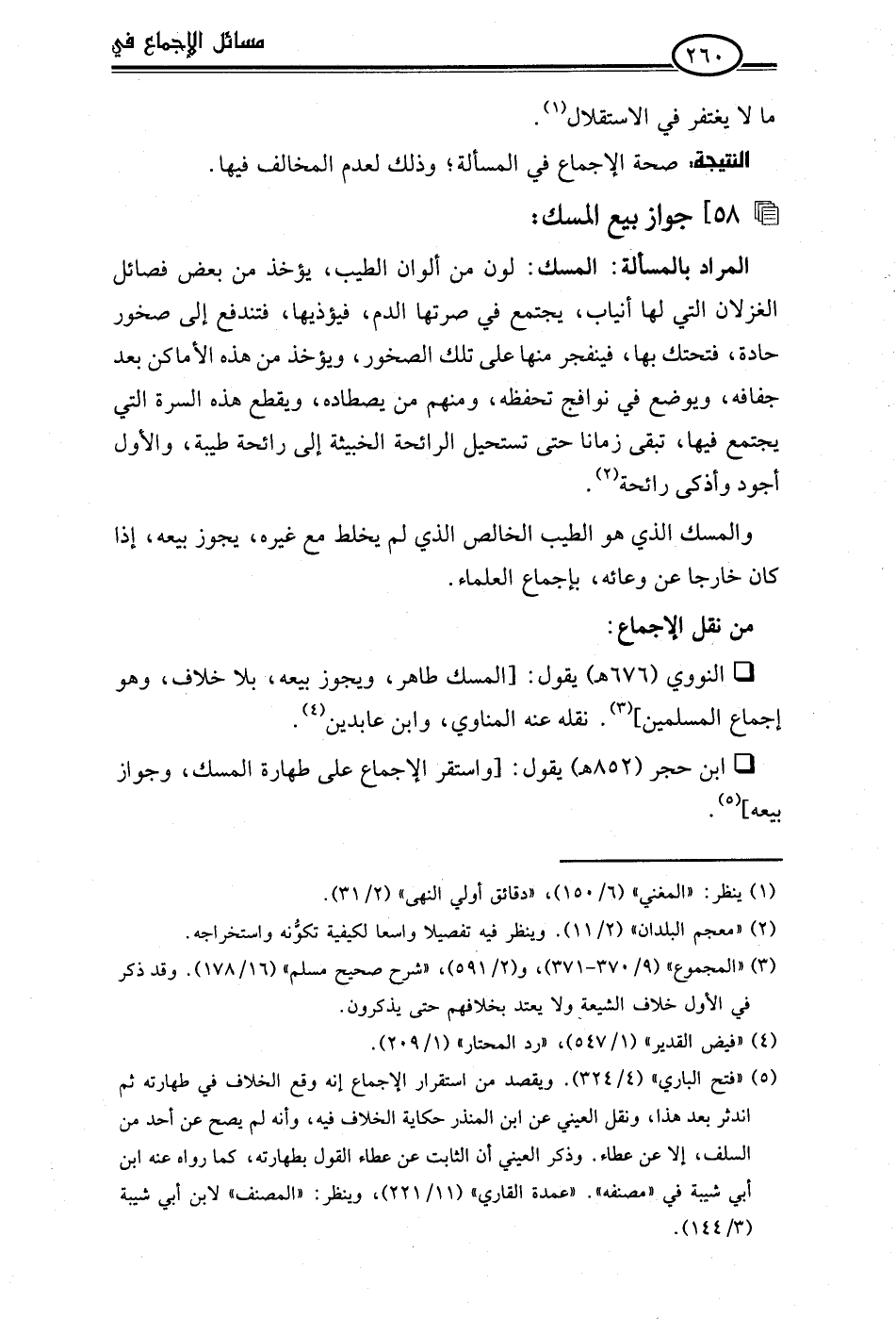 • ابن حجر (852 هـ) يقول: [واستقر الإجماع على طهارة المسك، وجواز بيعه] (¬5).