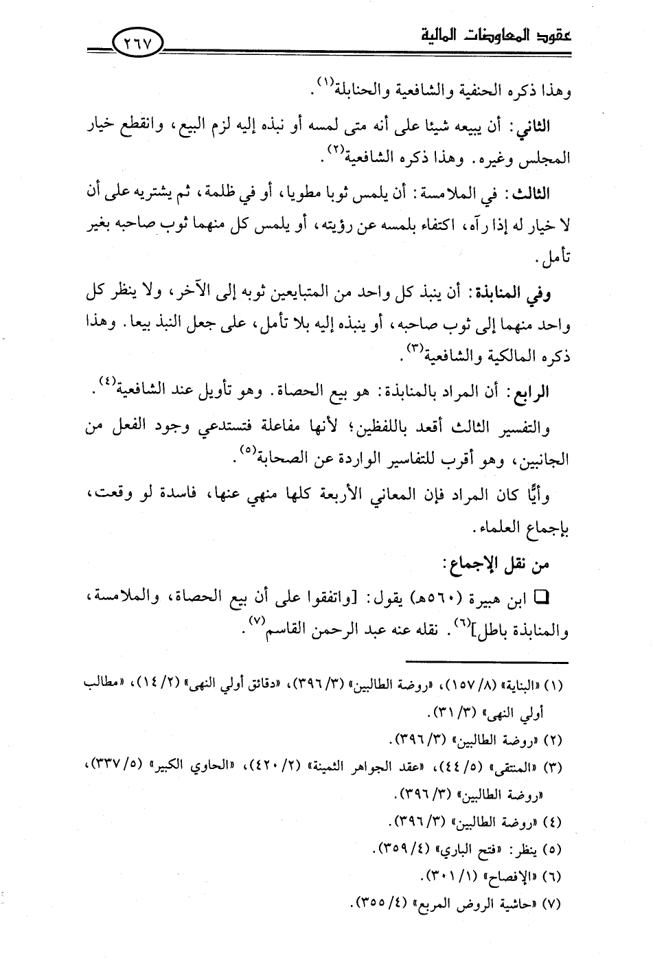 • ابن هبيرة (560 هـ) يقول: [واتفقوا على أن بيع الحصاة، والملامسة، والمنابذة باطل] (¬6). نقله عنه عبد الرحمن القاسم (¬7).