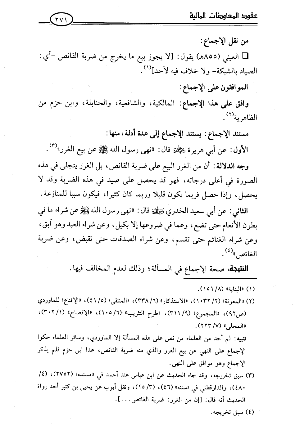 • العيني (855 هـ) يقول: [لا يجوز بيع ما يخرج من ضربة القانص -أي: الصياد بالشبكة - ولا خلاف فيه لأحد] (¬1).