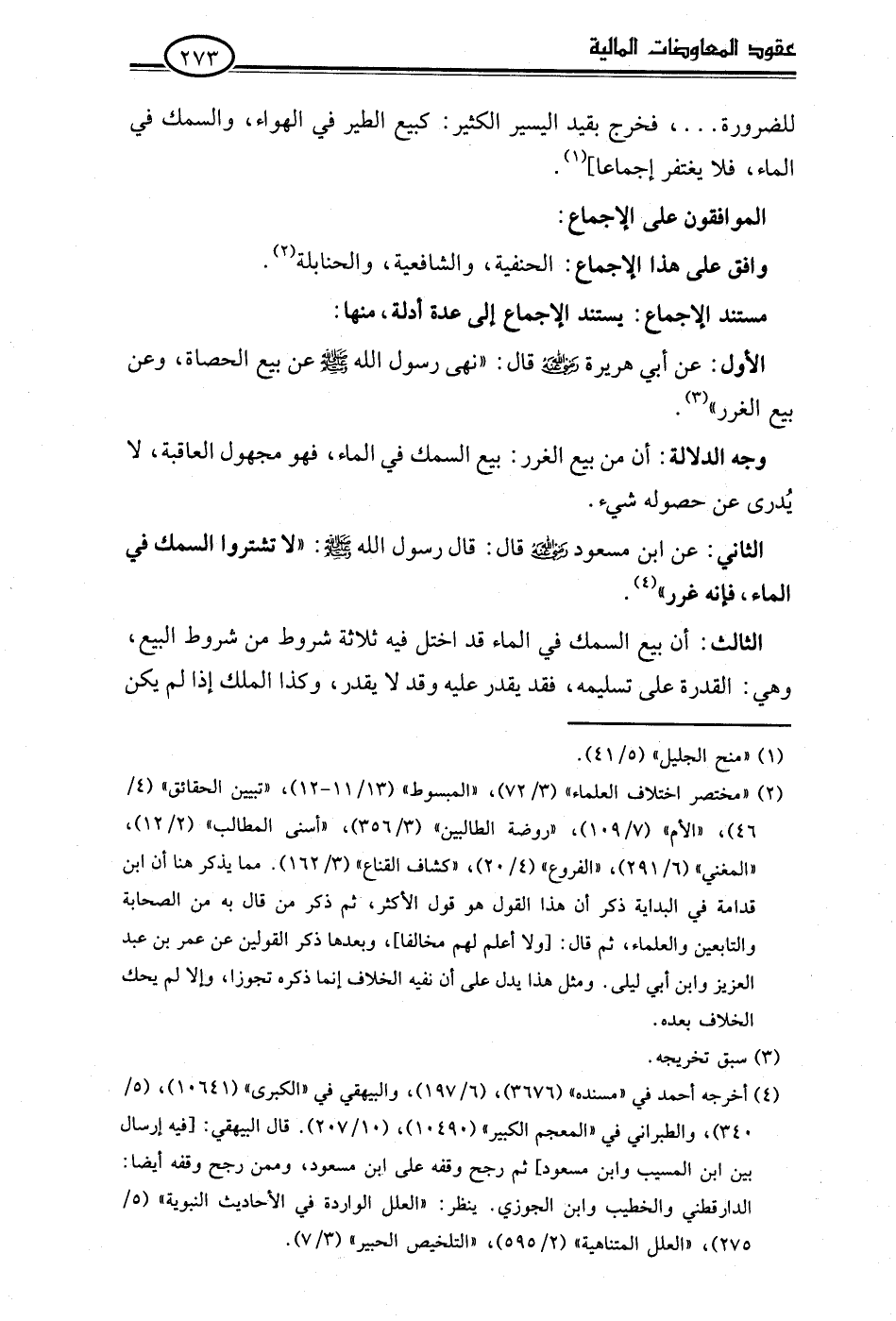 الثاني: عن ابن مسعود -رضي اللَّه عنه- قال: قال رسول اللَّه -صلى اللَّه عليه وسلم-: "لا تشتروا السمك في الماء، فإنه غرر" (¬4).
