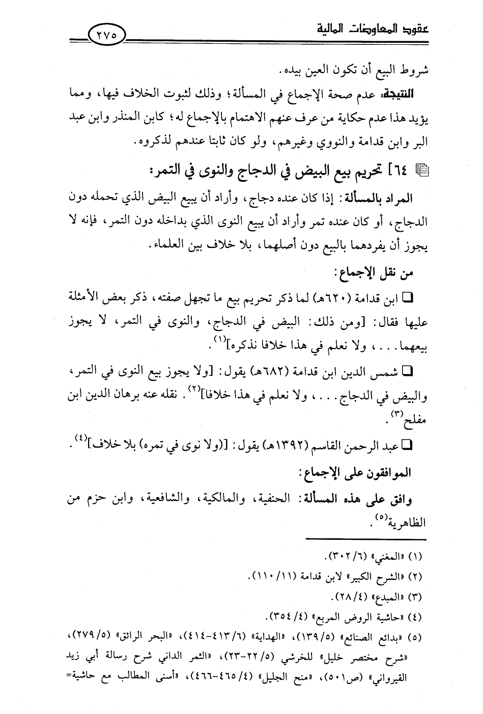 • شمس الدين ابن قدامة (682 هـ) يقول: [ولا يجوز بيع النوى في التمر، والبيض في الدجاج. . .، ولا نعلم في هذا خلافا] (¬2). نقله عنه برهان الدين ابن مفلح (¬3).