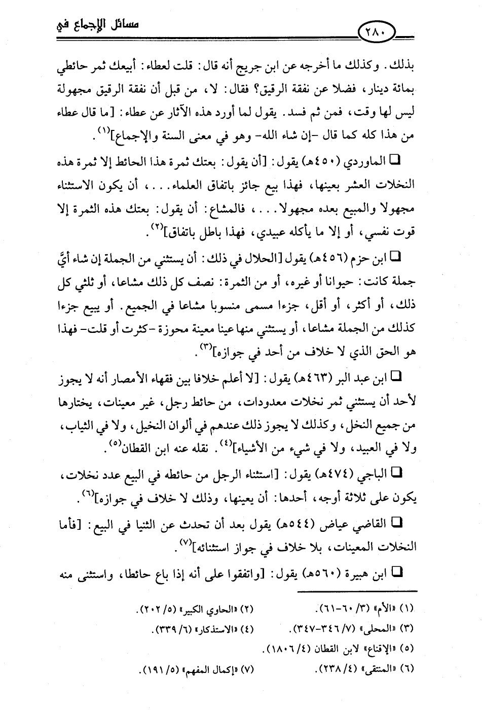 • ابن عبد البر (463 هـ) يقول: [لا أعلم خلافا بين فقهاء الأمصار أنه لا يجوز لأحد أن يستثني ثمر نخلات معدودات، من حائط رجل، غير معينات، يختارها من جميع النخل، وكذلك لا يجوز ذلك عندهم في ألوان النخيل، ولا في الثياب، ولا في العبيد، ولا في شيء من الأشياء] (¬4). نقله عنه ابن القطان (¬5).