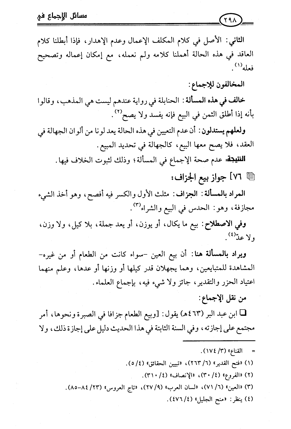 • ابن عبد البر (463 هـ) يقول: [وبيع الطعام جزافا في الصبرة ونحوها، أمر مجتمع على إجازته، وفي السنة الثابتة في هذا الحديث دليل على إجازة ذلك، ولا