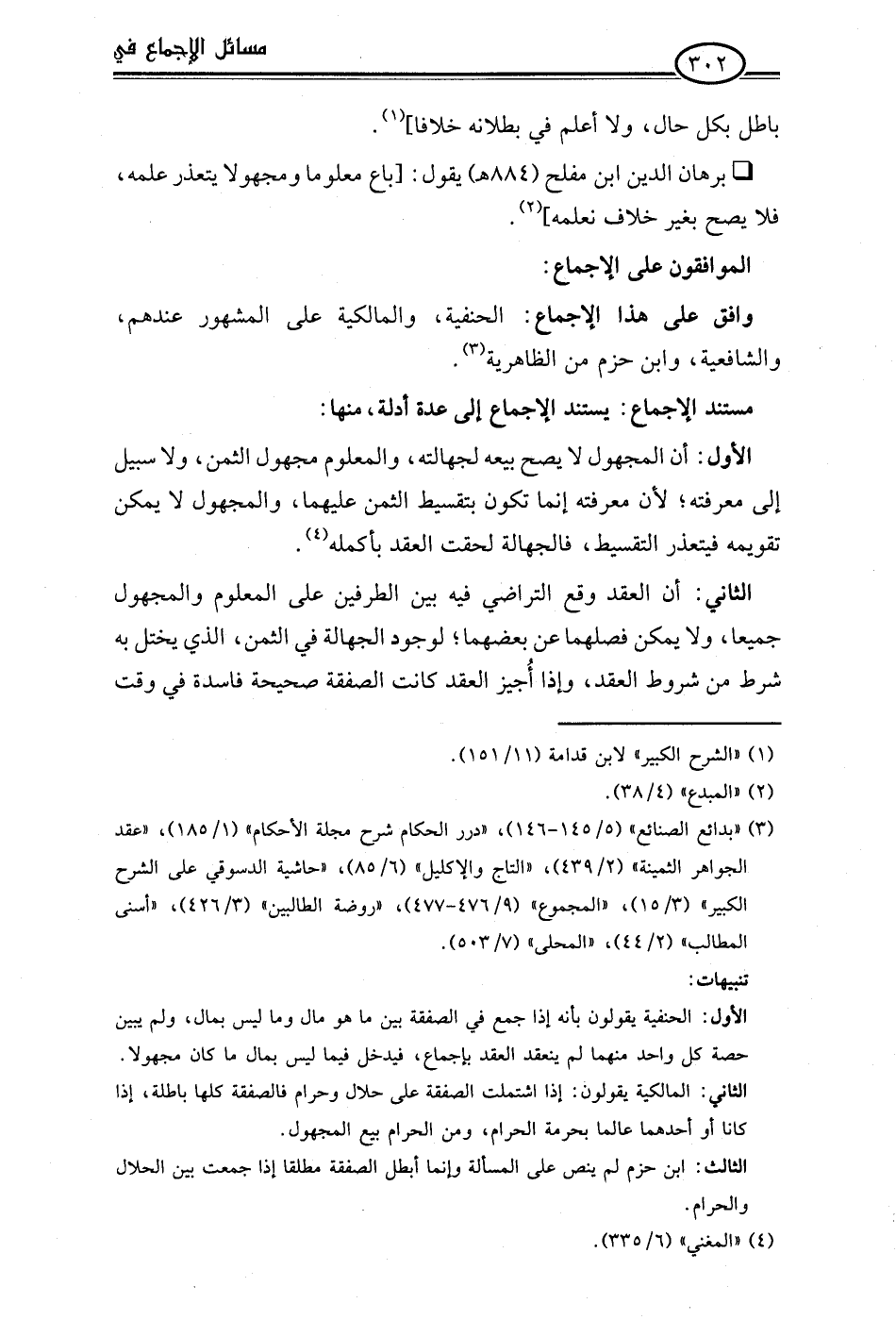 • برهان الدين ابن مفلح (884 هـ) يقول: [باع معلوما ومجهولا يتعذر علمه، فلا يصح بغير خلاف نعلمه] (¬2).
